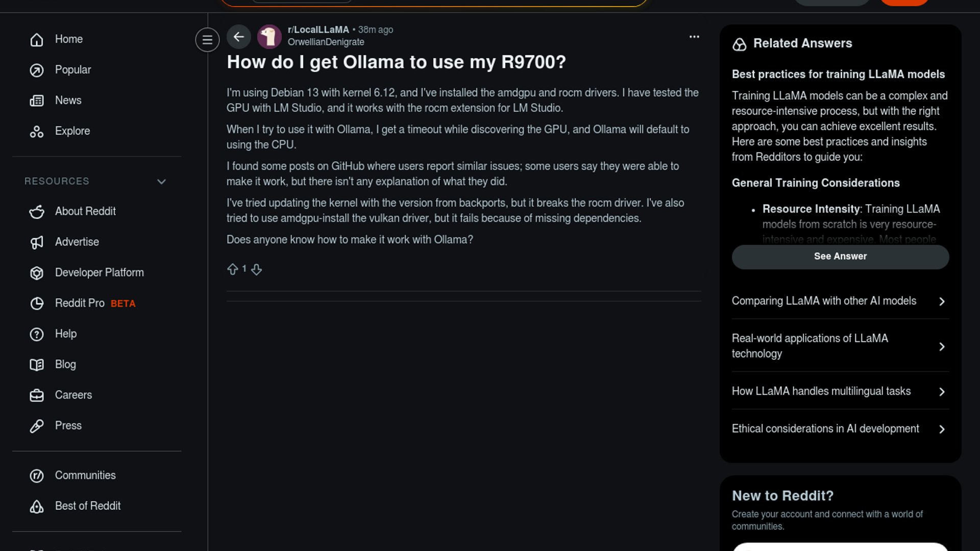 A Reddit user reports that Ollama on Debian 13 times out while discovering an AMD Radeon AI PRO R9700 and falls back to CPU, even though the same ROCm stack works in LM Studio. Similar GitHub reports around gfx1201 suggest this is likely an Ollama ROCm backend support gap rather than a simple one-machine setup mistake.