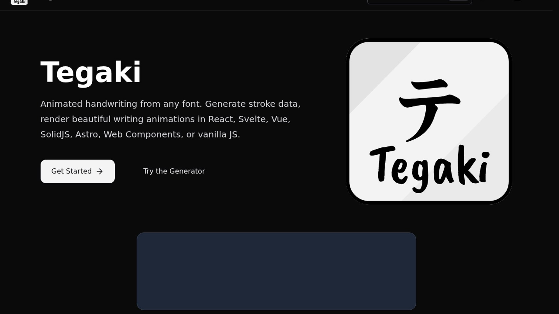 Tegaki is an open-source library that generates stroke data from fonts and renders handwriting-style text animations as a React-friendly component, with support for multiple frameworks. It includes a font generation pipeline so developers can ship natural-looking animated handwriting without manual path work.