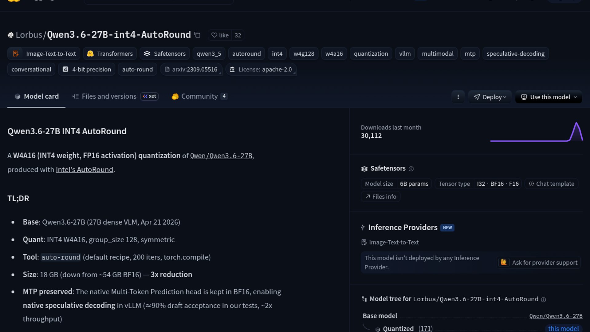 A community quant of Qwen3.6-27B hits 105-108 tokens per second on a single RTX 5090 while keeping the model’s native 256k context window in vLLM 0.19. The recipe leans on AutoRound INT4, FlashInfer, fp8 KV cache, and MTP speculative decoding to squeeze both throughput and long-context capacity out of the box.