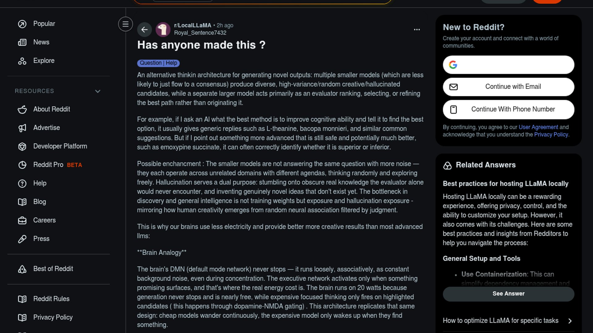 A conceptual architecture proposed on r/LocalLLaMA mimics the human brain by using small models for continuous generation and a large model for selective evaluation. This approach treats hallucinations as creative features, producing diverse candidates that the larger executive model then ranks to foster novelty.