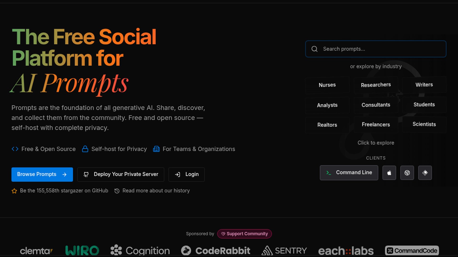 prompts.chat is the rebrand and modernization of Awesome ChatGPT Prompts: a free, open-source prompt library where users can share, discover, and collect prompts from the community. The project positions itself as a privacy-friendly, self-hostable prompt platform for individuals, teams, and organizations, with support for multiple AI assistants, search and tagging, and private deployments with custom branding and authentication.