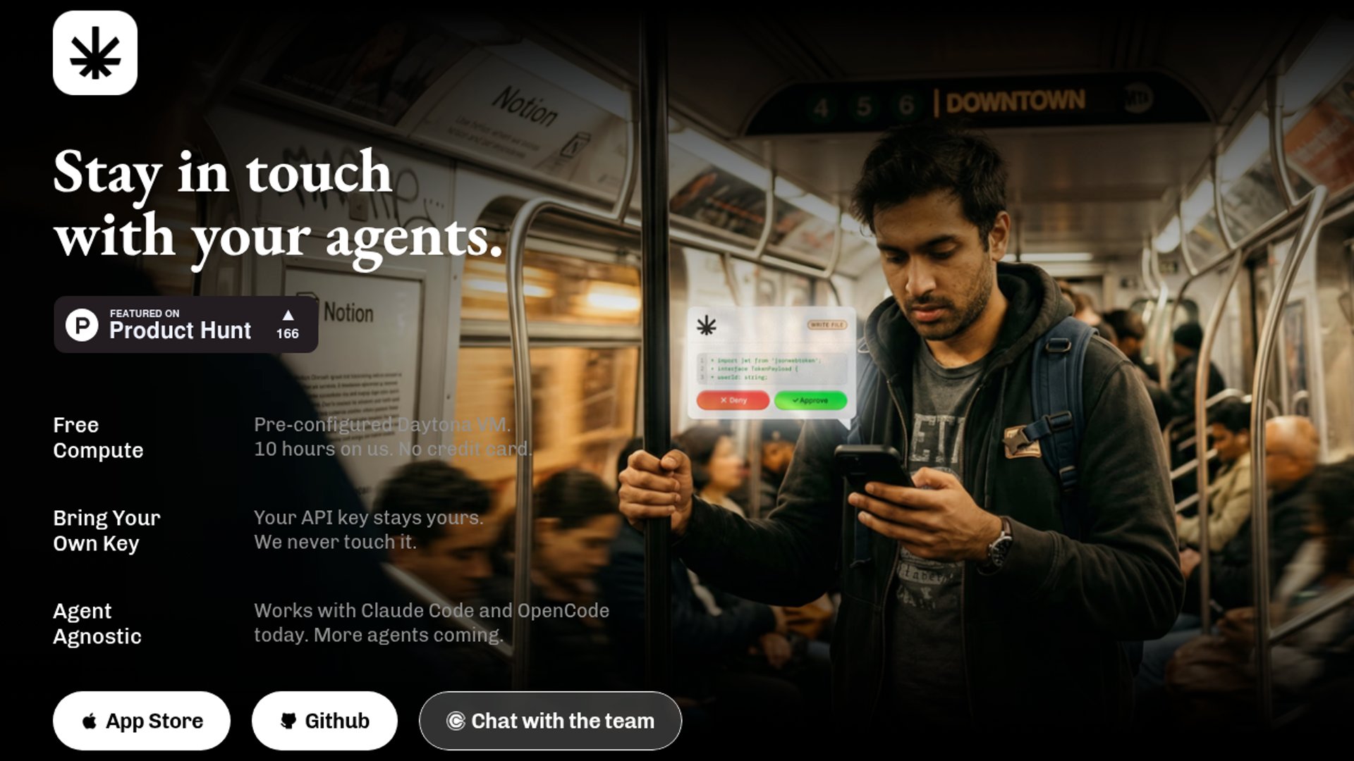 Grass is a developer infrastructure product that pairs a pre-configured Daytona VM with a mobile control layer for AI coding agents. It is aimed at people running Claude Code or OpenCode who want their sessions to keep going without tying up a laptop, while still being able to monitor output, approve actions, and jump in mid-session from a phone. The pitch is simple: no setup, no config, 10 free hours to start, and a persistent environment that stays ready around the clock.