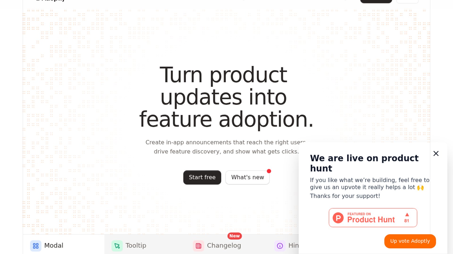 Adoptly is an in-app communication tool for SaaS products that helps teams create, target, and measure announcements, update banners, modals, hints, and changelogs. Its pitch is that product updates should feel native to the app and drive actual feature discovery and adoption, not just broadcast news. The site emphasizes no-code publishing, audience targeting, and analytics, with pricing positioned as relatively affordable for smaller teams.