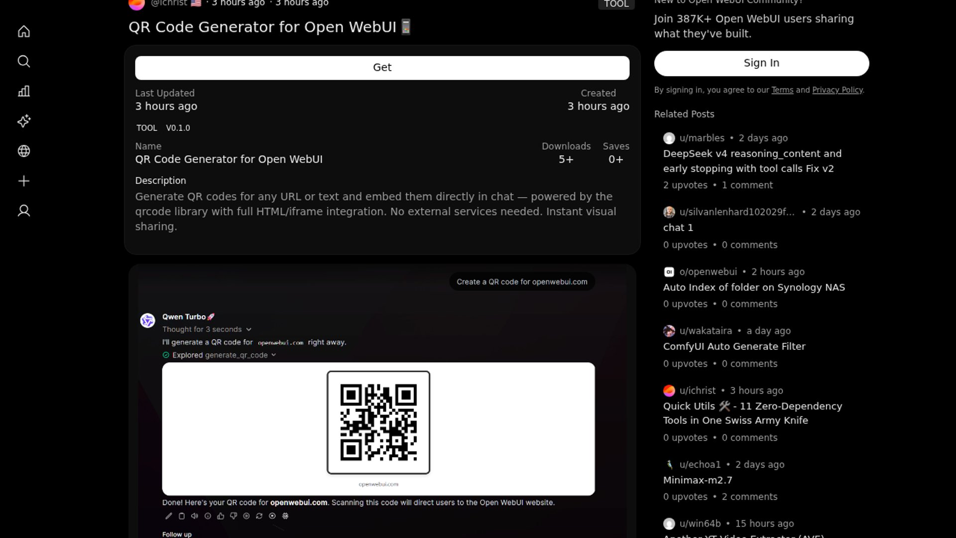 This Open WebUI community tool generates QR codes for any URL or text and renders them directly in chat, with no external service required. The maker says it’s built on the qrcode library with HTML/iframe integration and has already been downloaded 5+ times.
