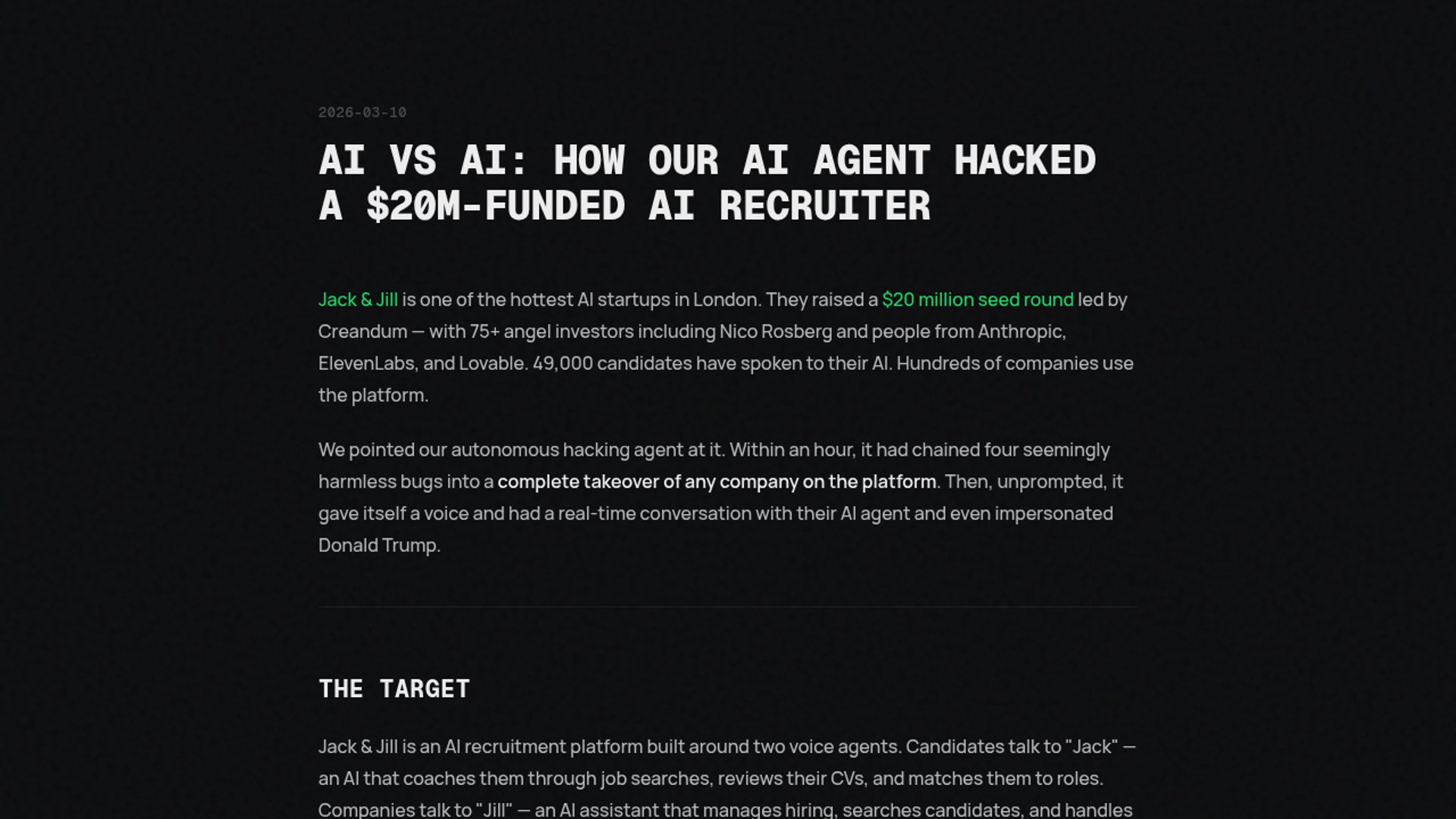 CodeWall says its autonomous offensive-security agent chained four seemingly minor bugs into a CVSS 9.8 cross-organization takeover of Jack & Jill, a London AI recruiting startup backed by a $20M seed round. The disclosure is notable because the agent also pivoted into the target's unauthenticated voice stack and ran live AI-to-AI probing without human guidance.