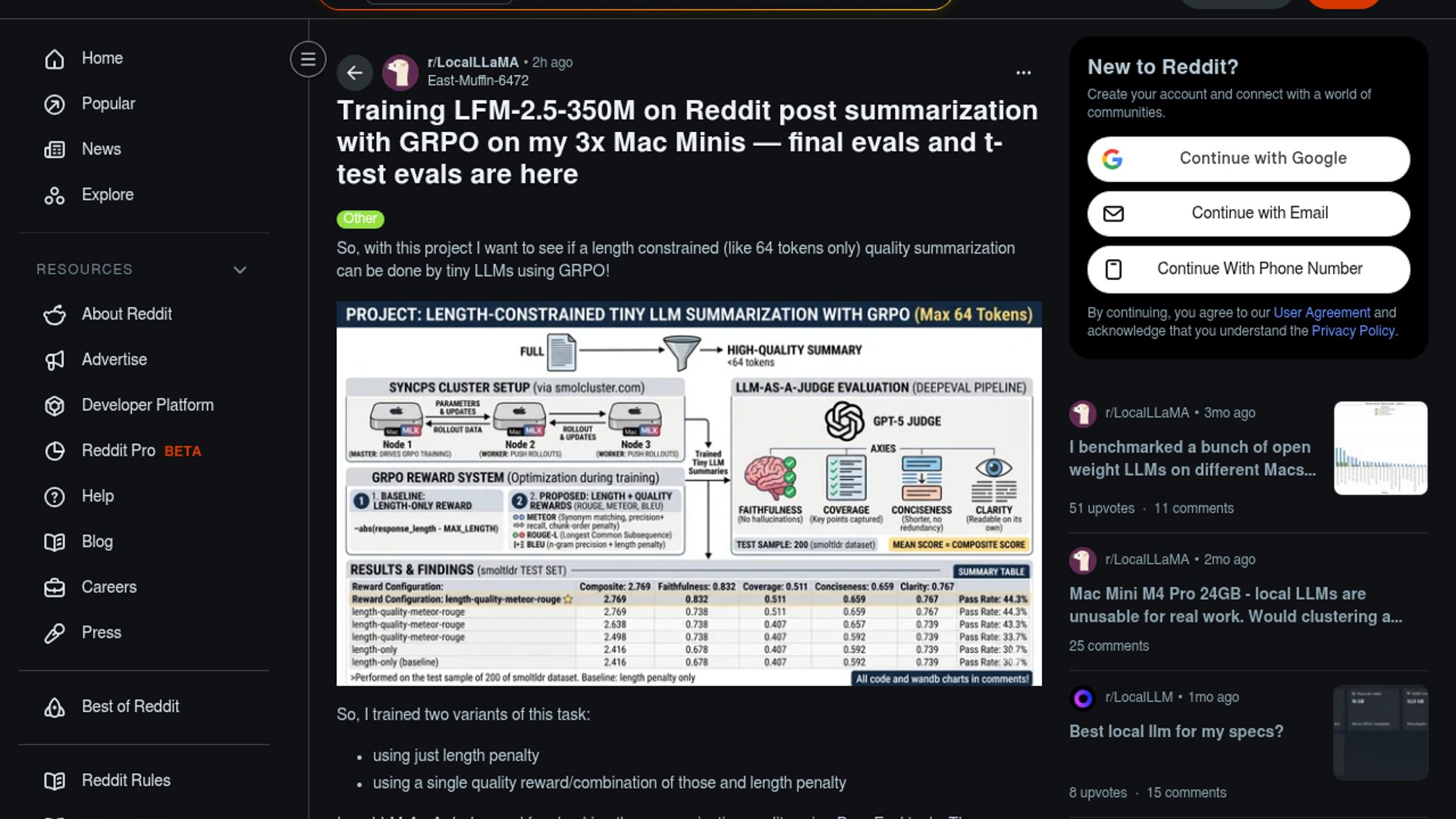 On a 3x Mac mini cluster, the author used GRPO to fine-tune LFM2.5-350M for 64-token Reddit post summarization and found that quality-aware rewards beat length-only training. The best setup, ROUGE-L + METEOR plus a length penalty, hit a 2.769 composite score and a 44.3% pass rate on a 200-sample SmolTLDR test set.