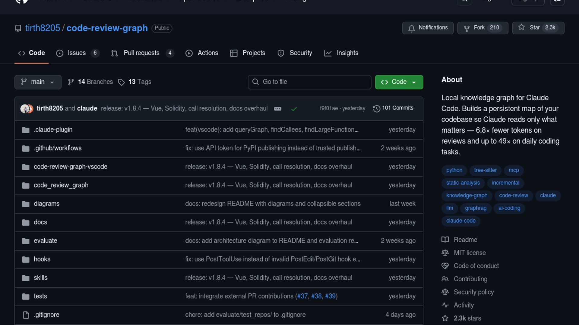 code-review-graph is a local knowledge graph for Claude Code that parses a repo with Tree-sitter, keeps it updated incrementally, and feeds the model only the files that matter. The project claims 6.8x fewer tokens on reviews and up to 49x on daily coding tasks.