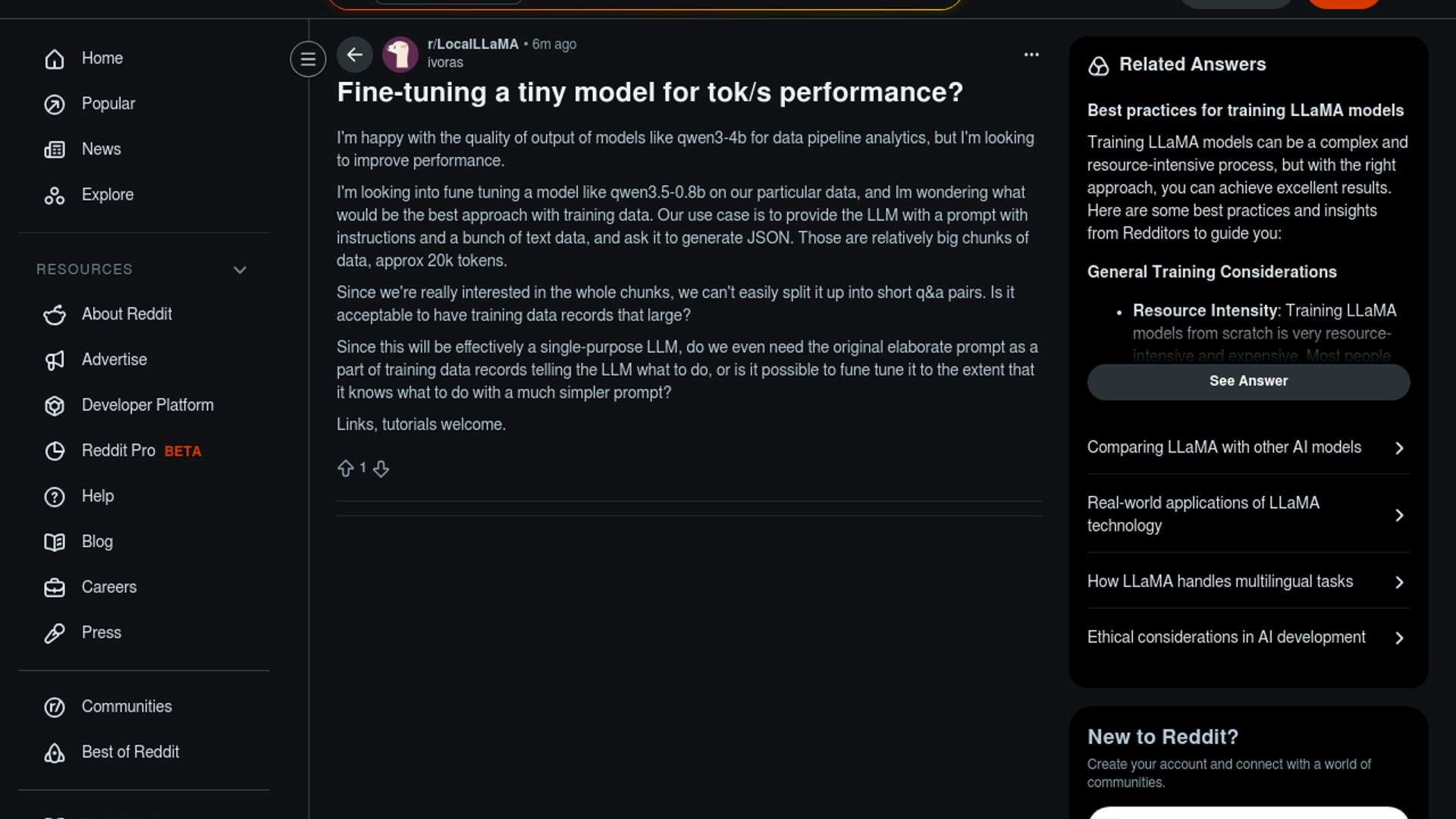A LocalLLaMA Reddit post asks whether a much smaller Qwen model can be fine-tuned for a narrow JSON-generation task on roughly 20k-token inputs to improve tokens-per-second performance over a larger 4B model. The core question is whether long full-context examples are viable training data and how much of the original instruction prompt can be baked into a single-purpose fine-tune.