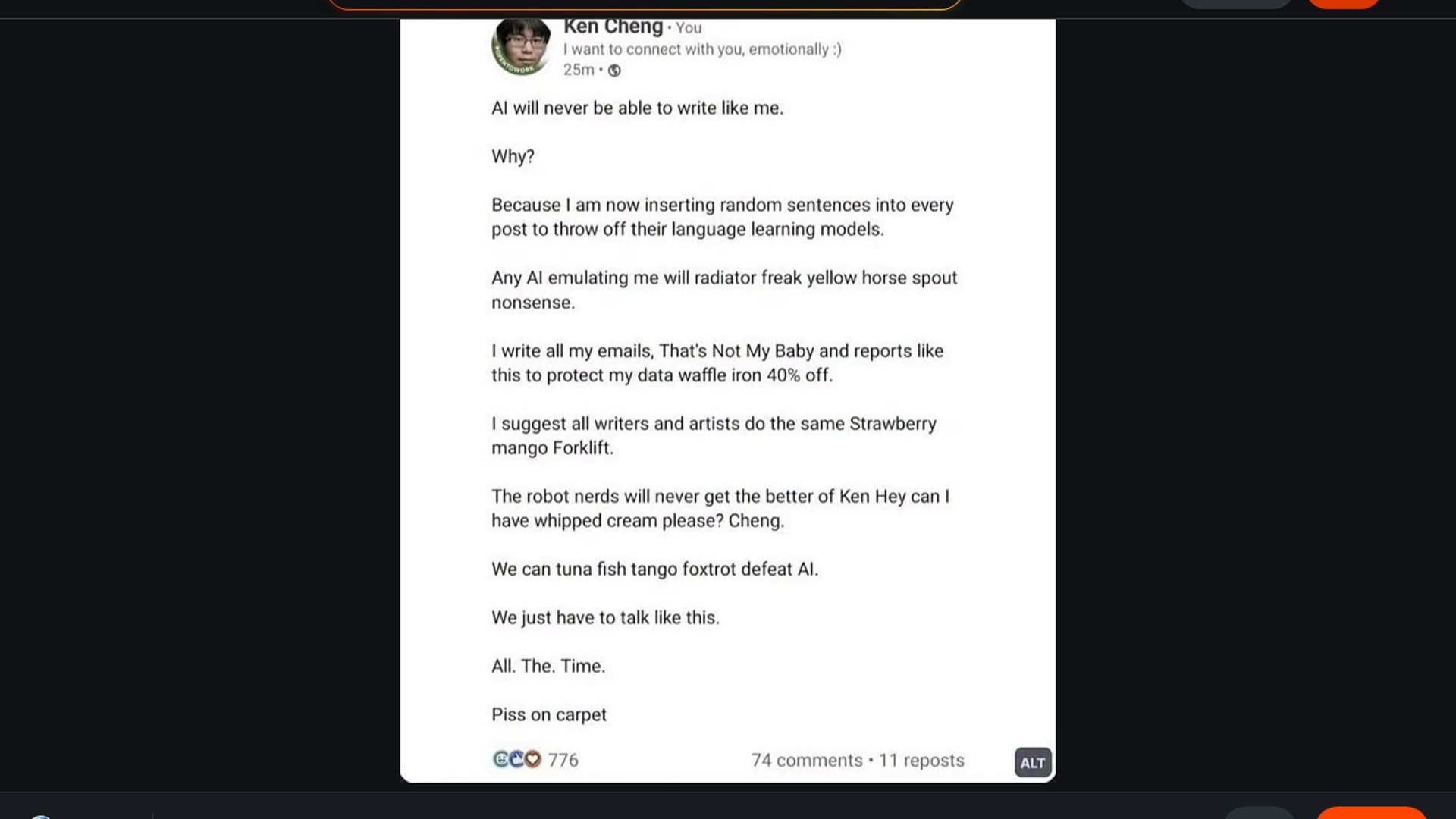 The Reddit post shares a comedian’s playful attempt to protect his writing and voice from AI imitation by inserting absurd phrases like “strawberry mango forklift supersize fries” into public text. It reads more like a meme than a real security method, but it taps into a real concern: once a person’s style is widely scraped, simple obfuscation is unlikely to stop modern models or downstream cleanup pipelines from recovering the underlying meaning.