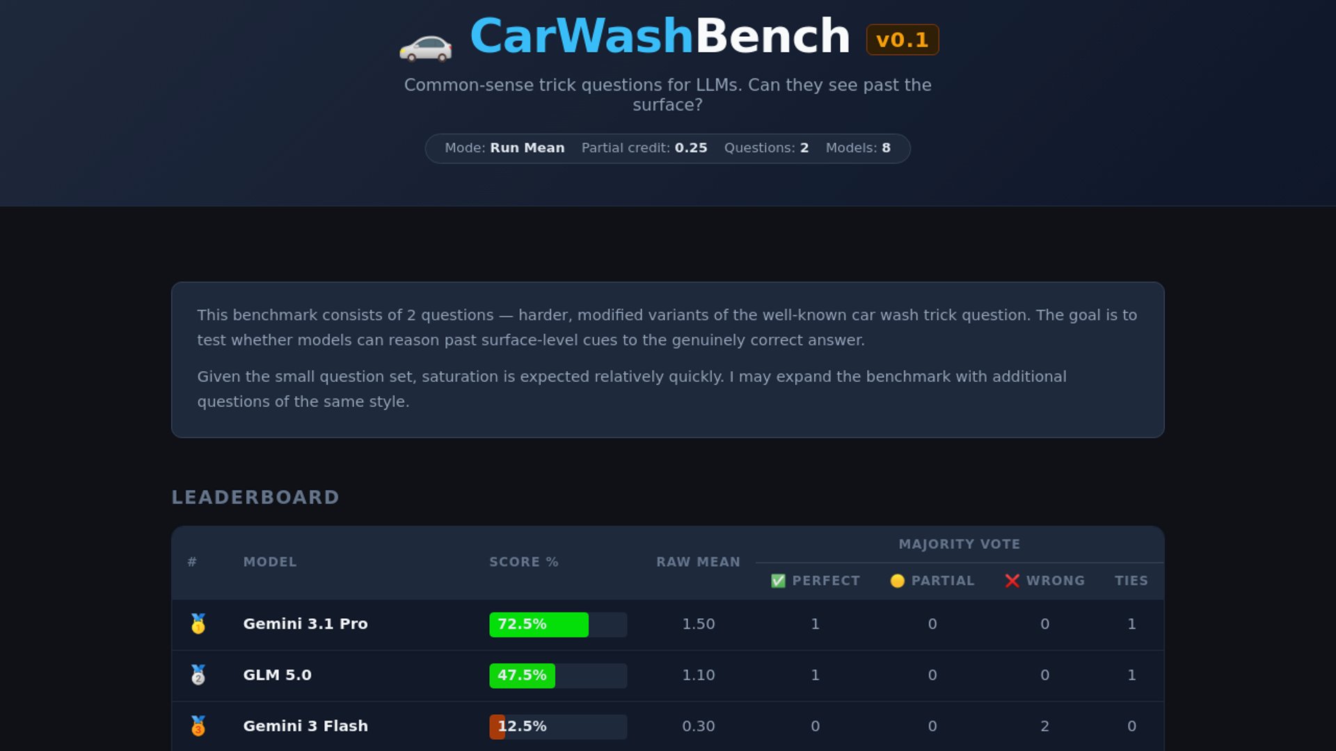 CarWashBench v0.1 is a tiny public benchmark built around harder variants of the classic car-wash trick question to test whether LLMs can reason past surface cues. Across eight frontier models and five runs per question, only Gemini 3.1 Pro and GLM 5.0 showed meaningful performance while most models scored 0%.