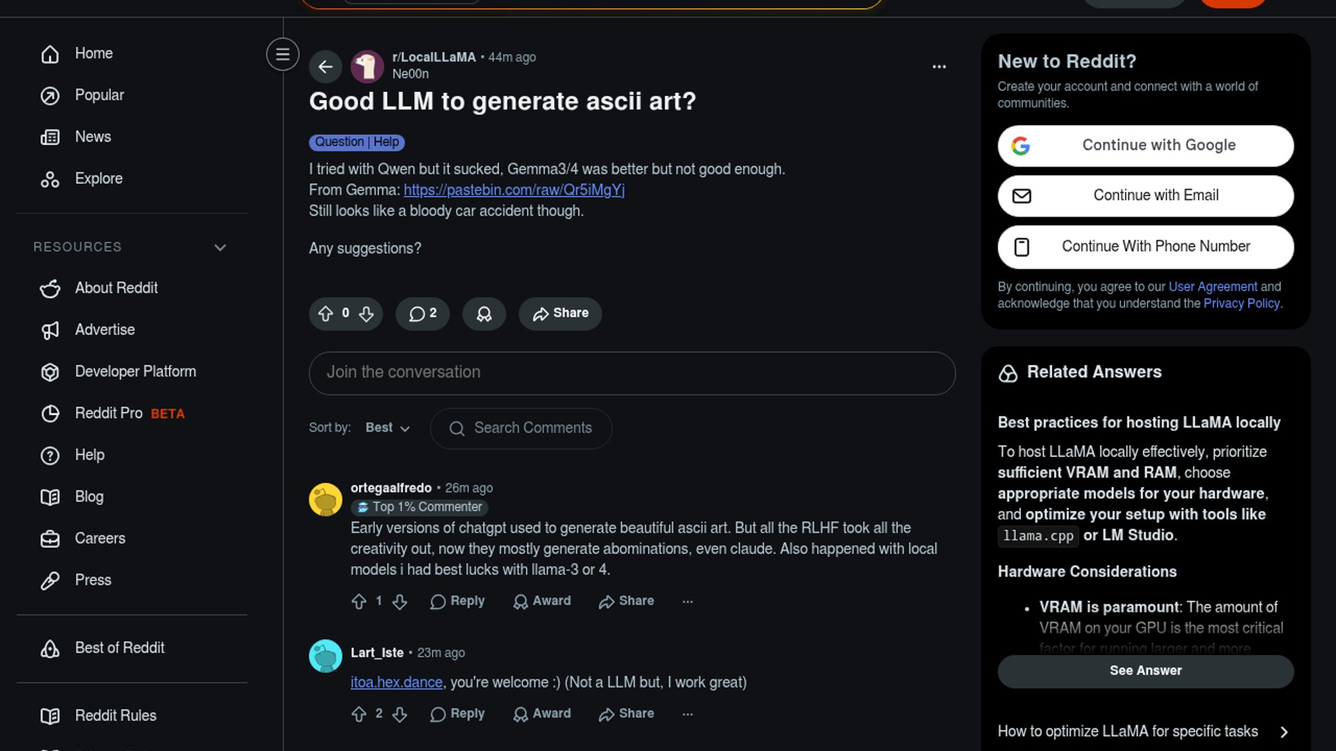 A Reddit user asks which local LLM can generate decent ASCII art after Qwen failed and Gemma 3/4 only got partway there. The thread quickly turns into a broader debate about whether text-only models are the wrong tool for a 2D, whitespace-sensitive task.