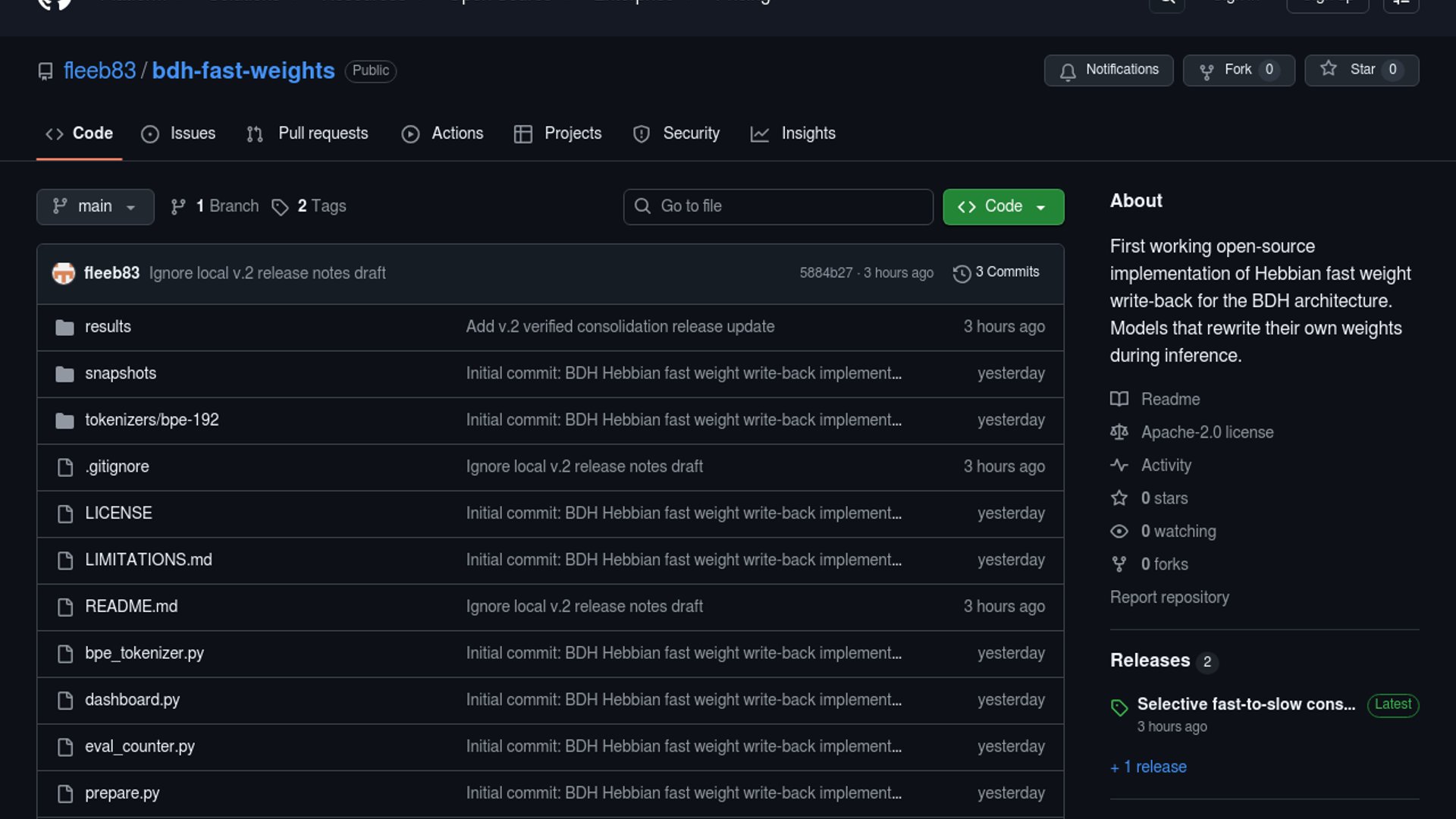 An independent researcher released bdh-fast-weights, an Apache-licensed implementation of BDH's missing Hebbian fast-weight write-back path. On synthetic n-back recall, it lifts the mechanism from chance to near-perfect accuracy and adds selective fast-to-slow consolidation that preserves most of the signal.