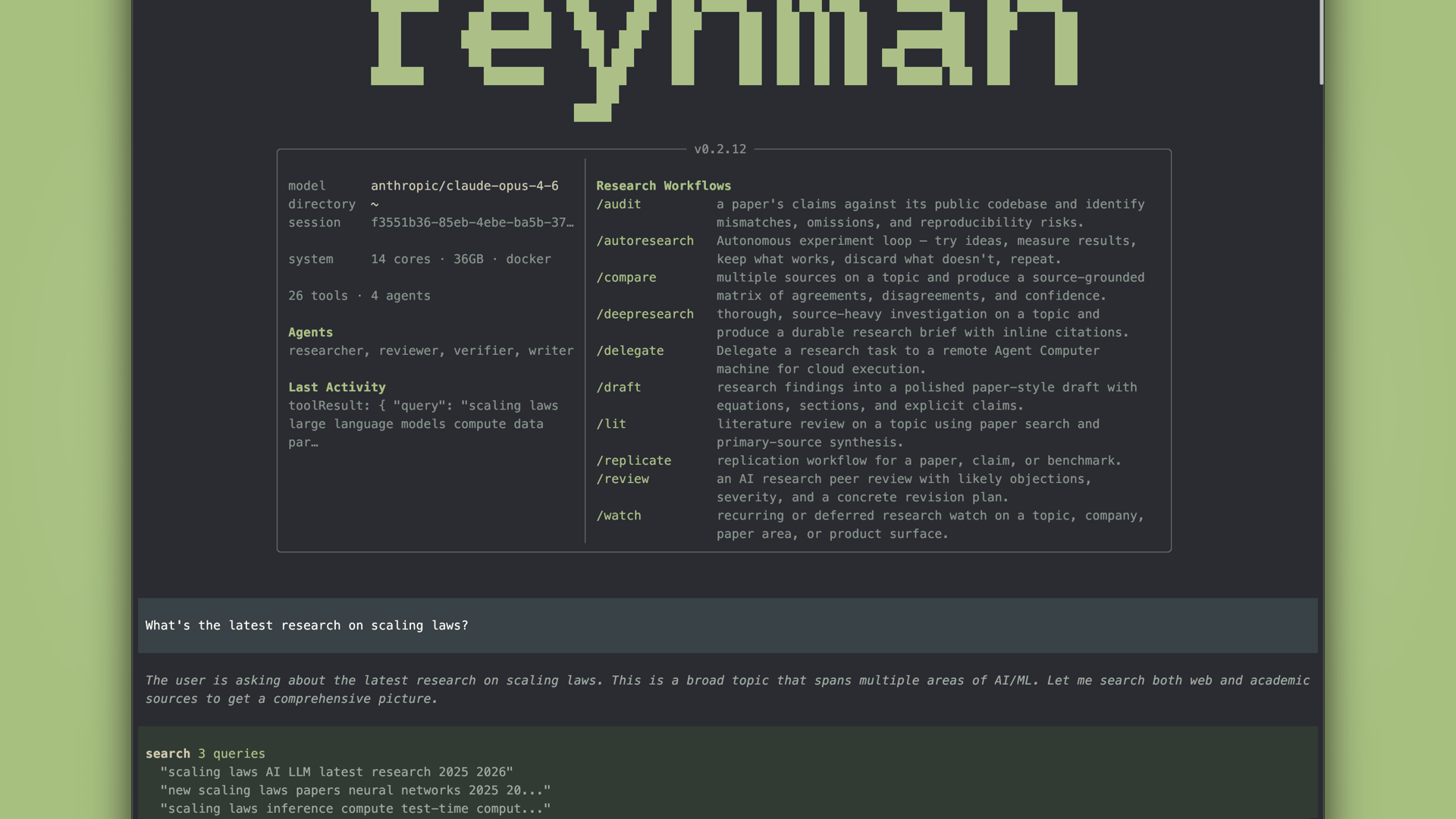 Feynman is an autonomous research system designed to automate complex scientific and machine learning workflows by coordinating specialized agents. It goes beyond simple search to perform deep literature reviews, audit paper claims against codebases, and replicate experiments on local or cloud-based GPUs.
