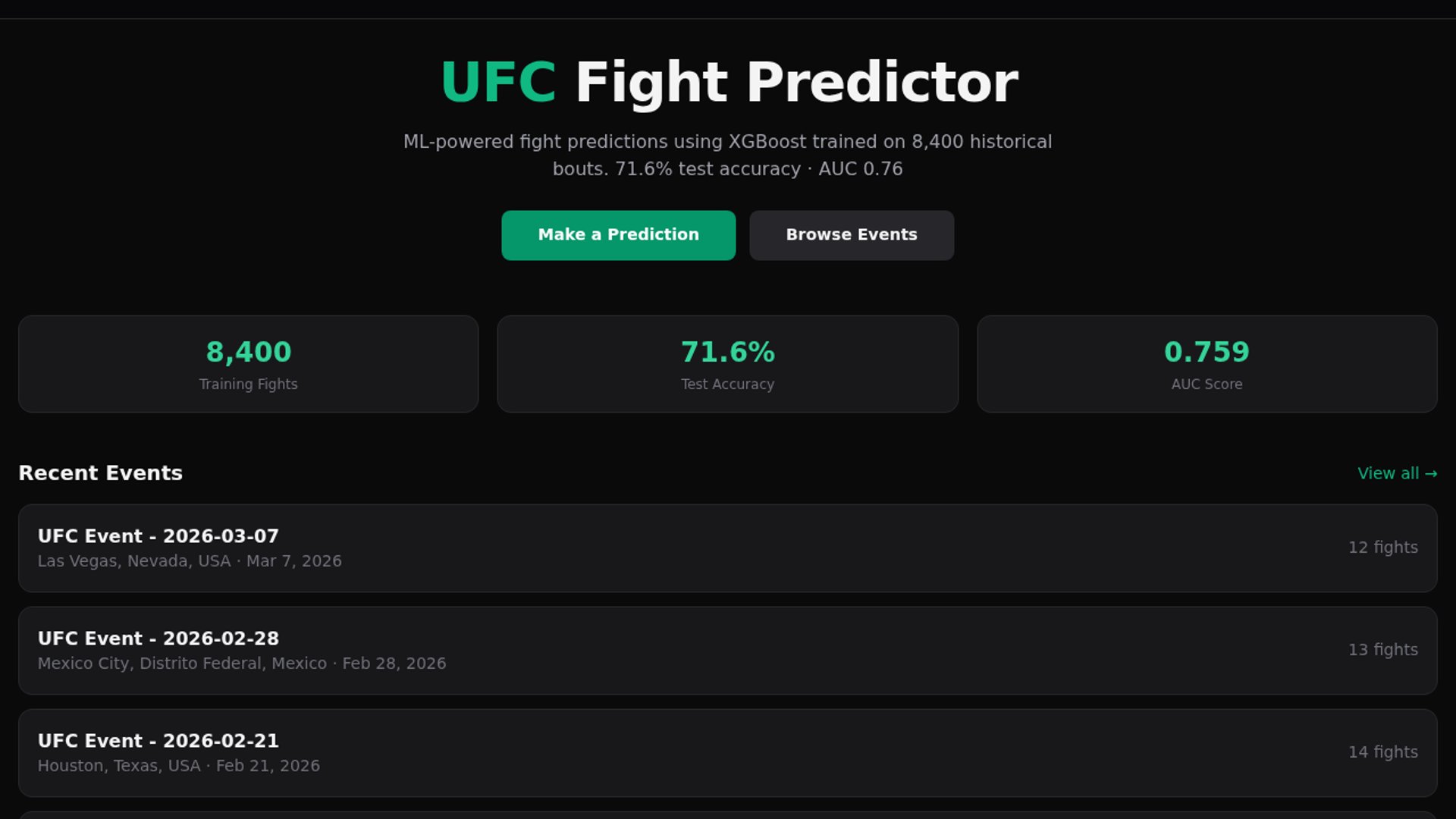 UFC Fight Predictor is a web app that uses an XGBoost model to predict UFC fight winners and generate natural-language explanations with Claude. It reports 71.6% test accuracy and a 0.76 AUC on 8,400 historical bouts.