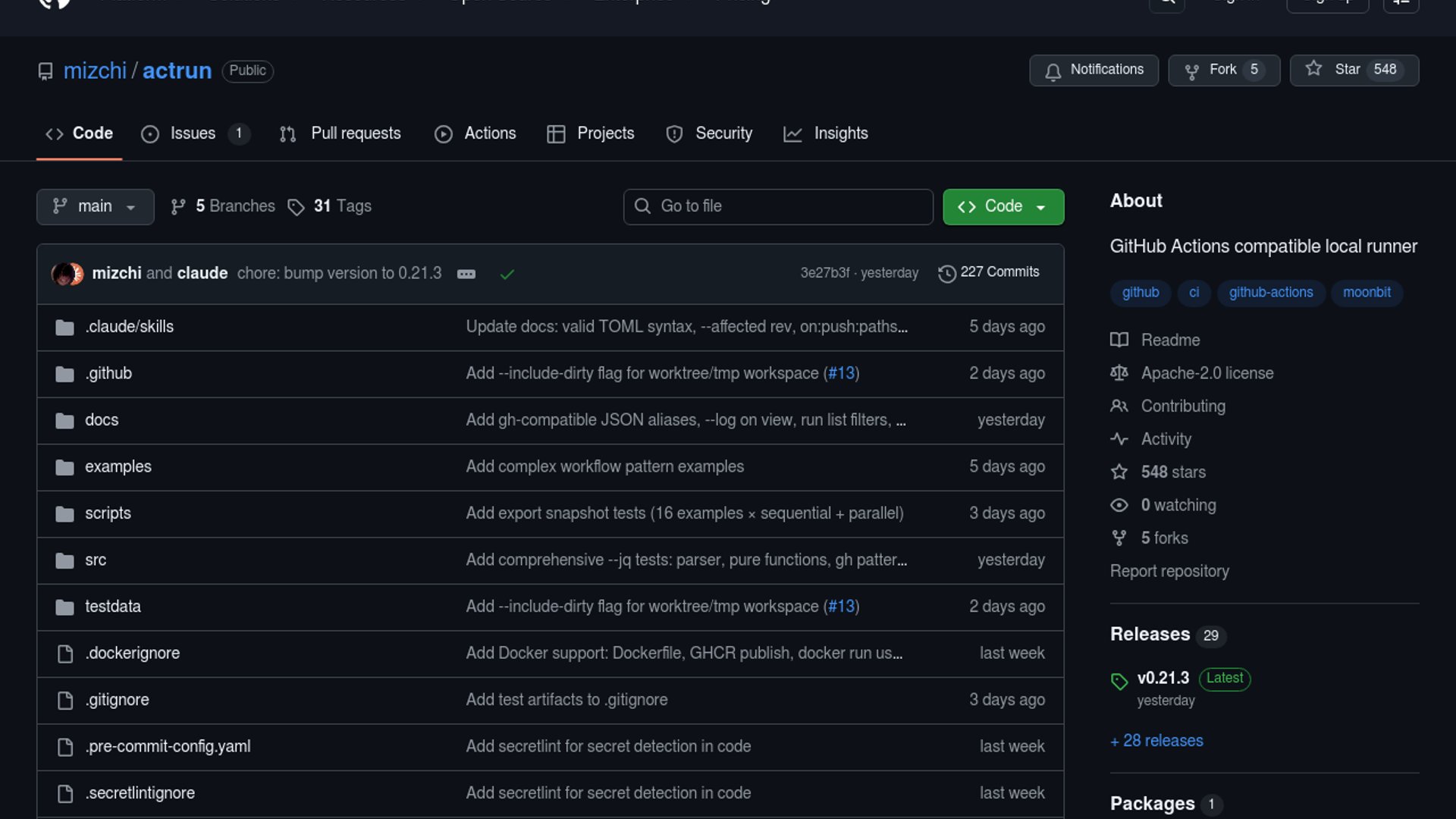 actrun is an open-source local GitHub Actions runner built with MoonBit that lets you run, debug, lint, and visualize workflows from your terminal with a `gh`-compatible CLI. It supports dry runs, isolated worktree execution, skipping actions you already have installed locally, and viewing run logs and artifacts, which makes it useful for tightening the feedback loop on CI changes and reducing broken pushes.