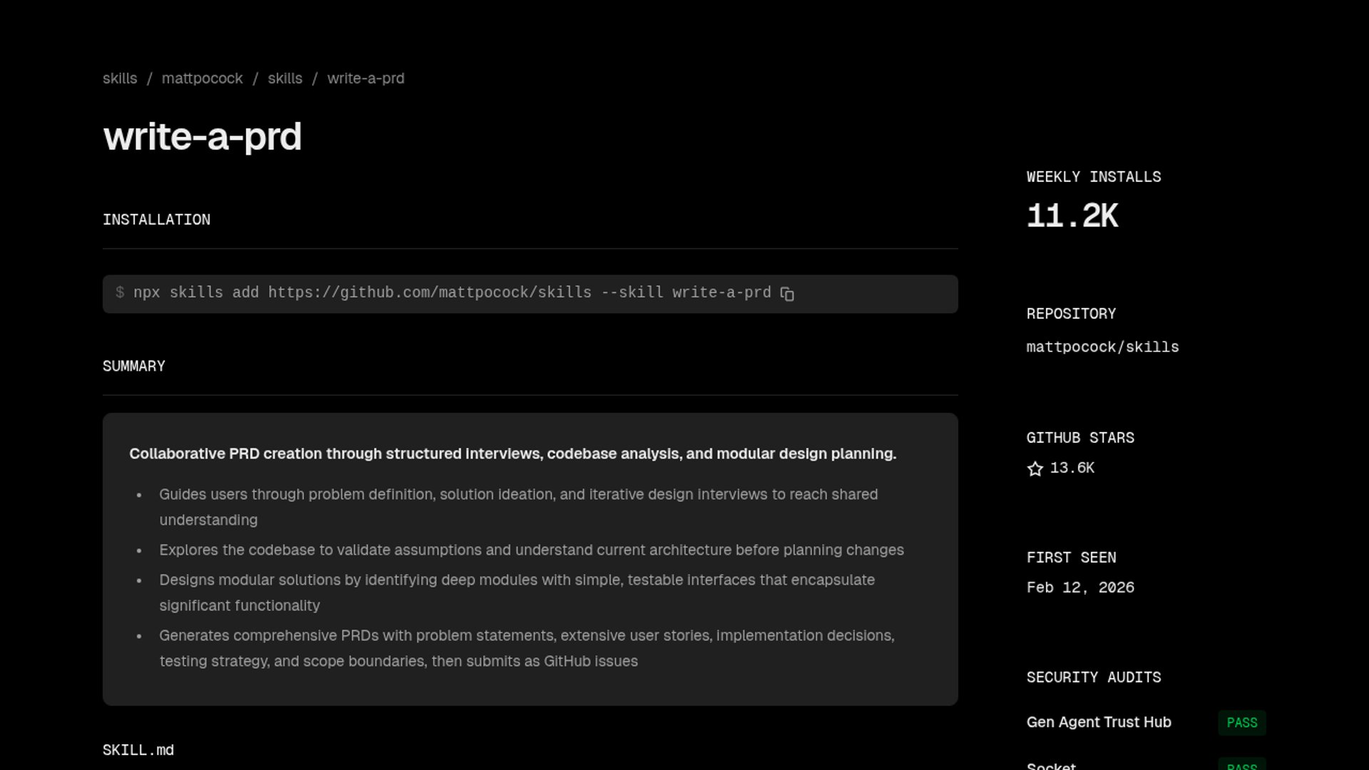 The notable piece is not just PRD generation, but the workflow discipline: it pushes discovery, repository verification, and explicit module design before implementation. That makes it a strong fit for teams that want AI-assisted planning to stay grounded in the real codebase, though its value still depends on the quality of the interview prompts and repo exploration.