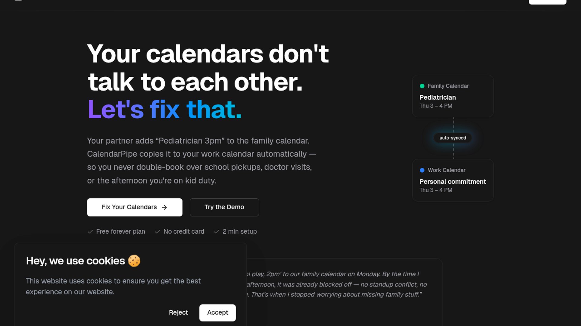 CalendarPipe is a calendar-sync platform that lets users filter, transform, and route events between Google Calendar, Outlook, Apple Calendar, and ICS feeds. It supports a visual builder, plain-English AI rule generation, and TypeScript for more advanced control, with invitation-based delivery so recipients do not need to install anything or grant OAuth access. The product also targets AI agents and developers with a REST API, CalDAV, MCP server, and hosted calendars that can send real calendar invites.