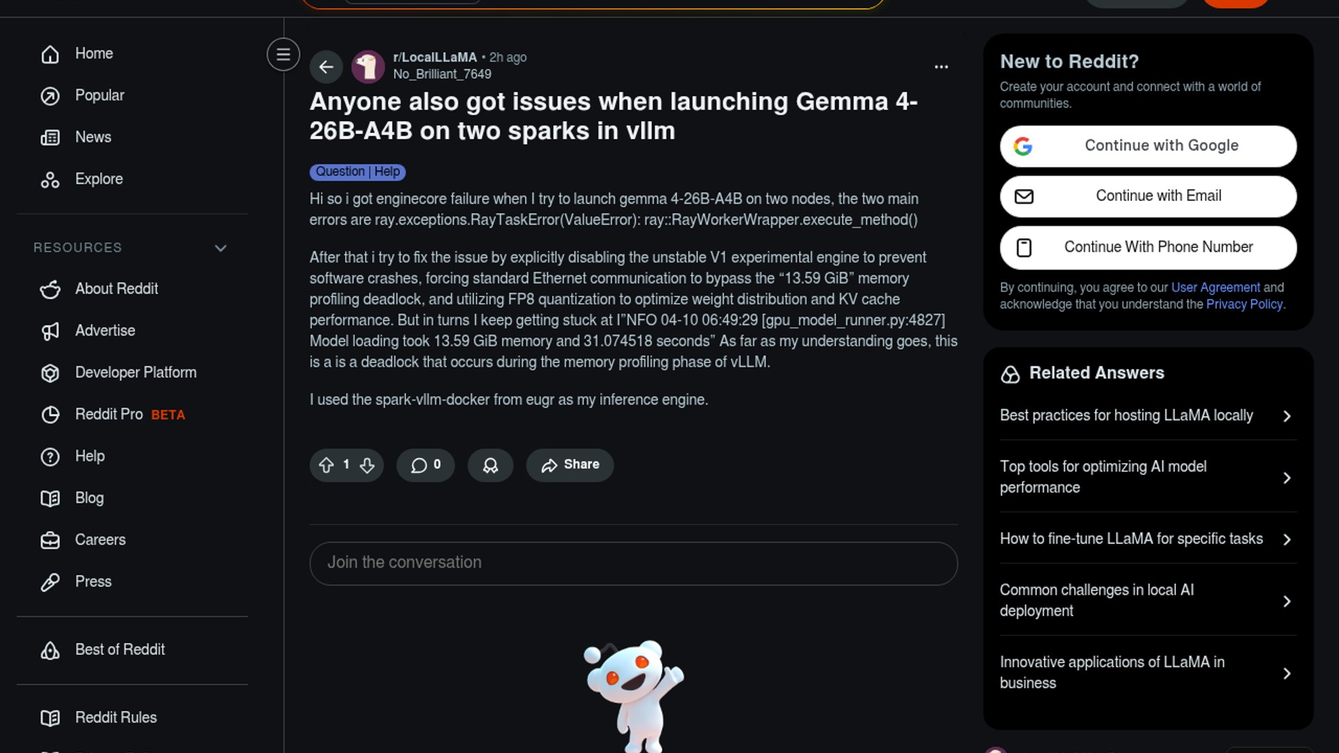 Developers are reporting engine-core failures and startup hangs when serving Google's Gemma 4 26B-A4B checkpoint in vLLM, especially across multi-node Spark setups. The model is a 26B MoE with only 3.8B active parameters, so this reads more like a serving-stack compatibility issue than a raw capacity limit.