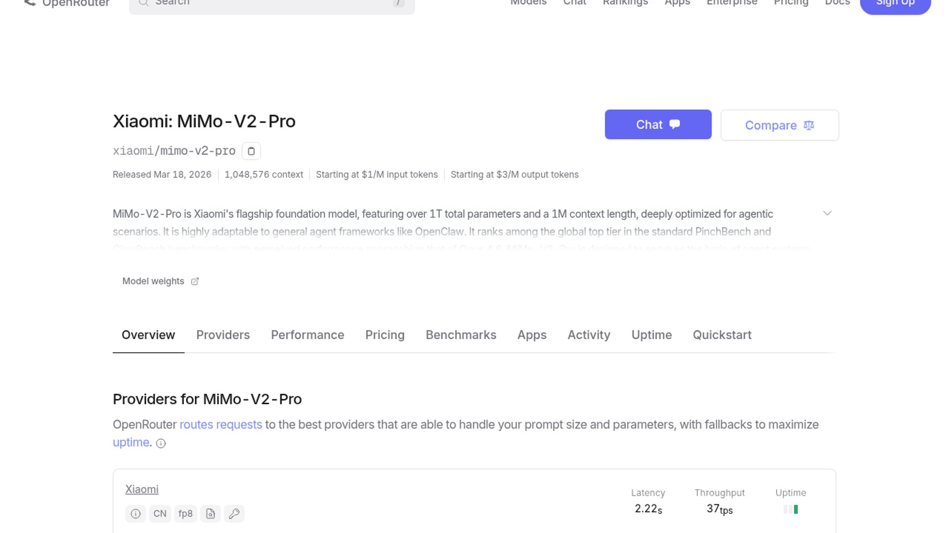 - –OpenRouter pegs MiMo-V2-Pro at over 1T total parameters, 1,048,576 context, and pricing from $1/$3 per million tokens.