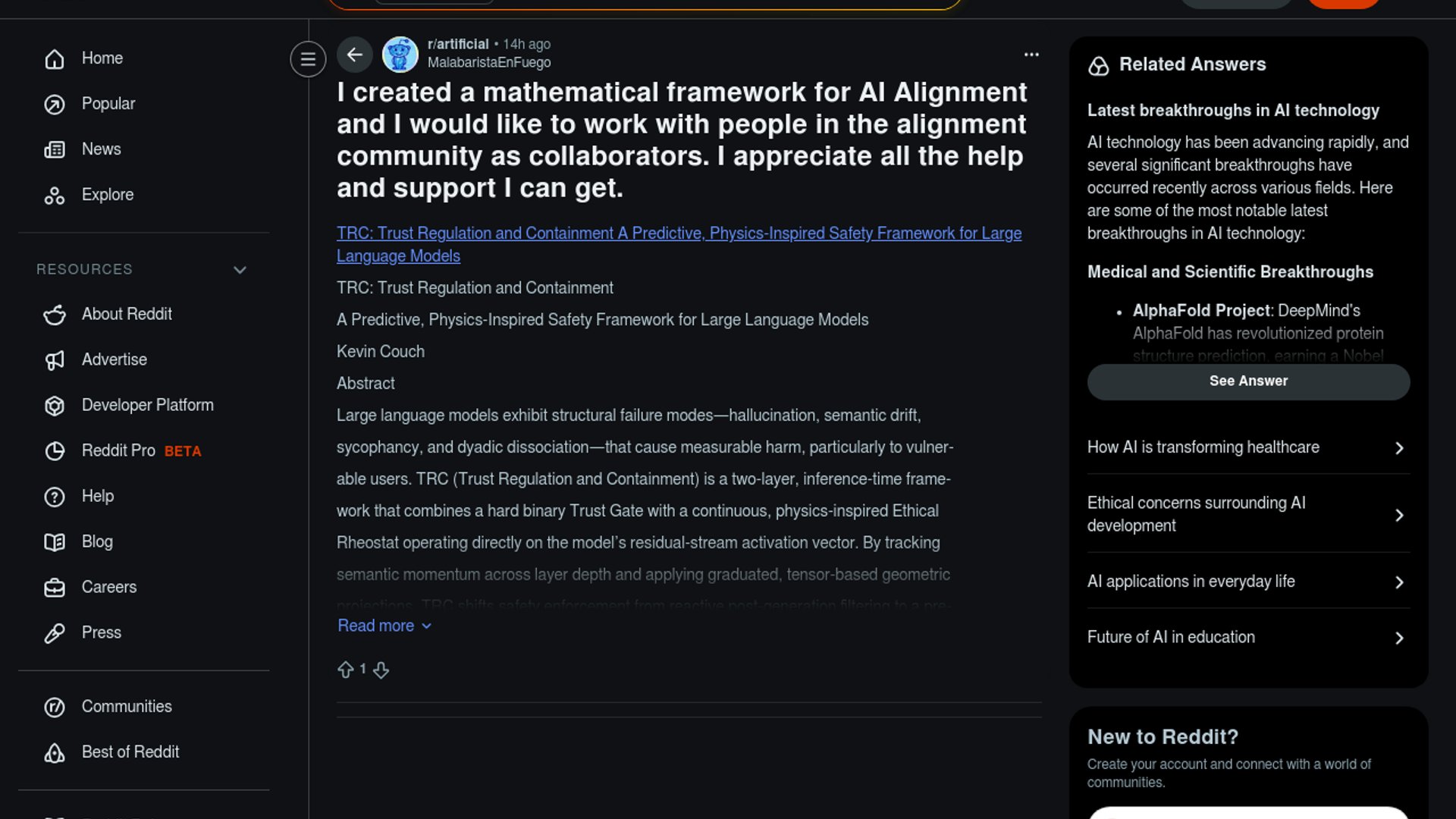 Kevin Couch shared a self-published Zenodo paper and Reddit call for collaborators describing TRC, an inference-time AI alignment framework for large language models. The paper proposes steering model residual-stream activations with a trust gate, ethical “rheostat,” and Kalman-filter-based control system to reduce failures like hallucination, semantic drift, and sycophancy.