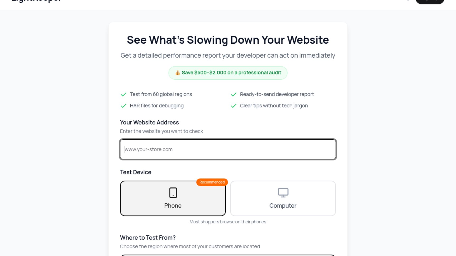 LightKeeper is a website performance testing tool that runs Lighthouse audits from 68 global regions, including logged-in pages, and packages the results into developer-ready reports. The launch pitch pairs plain-language guidance with an AI action plan so non-specialists can act on the data without decoding Lighthouse output.