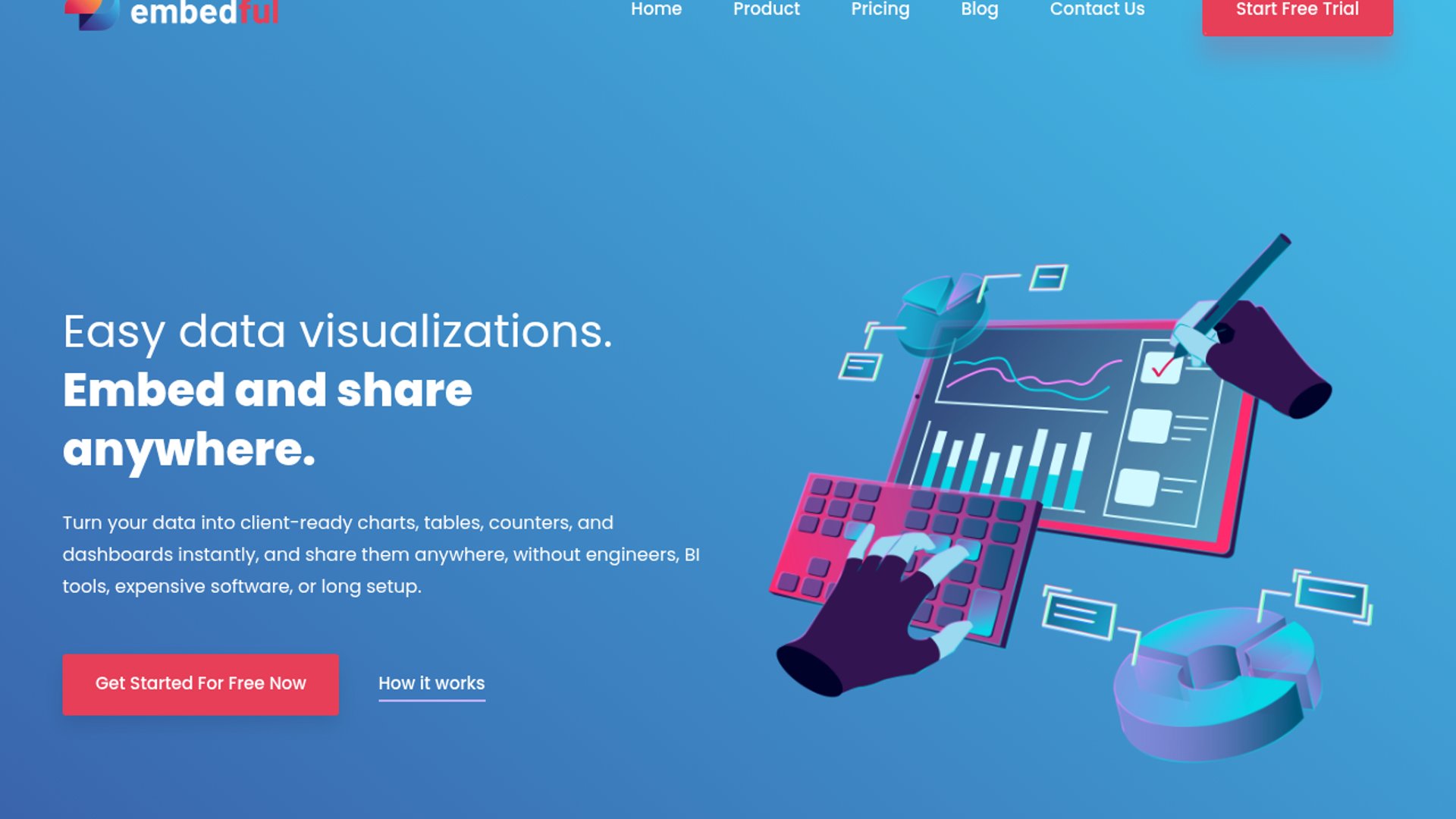 Embedful is an AI-powered data visualization platform that allows users to transform raw data from sources like Google Sheets, APIs, and CSVs into interactive, white-labeled charts and dashboards using natural language. It enables SaaS teams to embed professional-grade analytics directly into their products without building a custom engine.