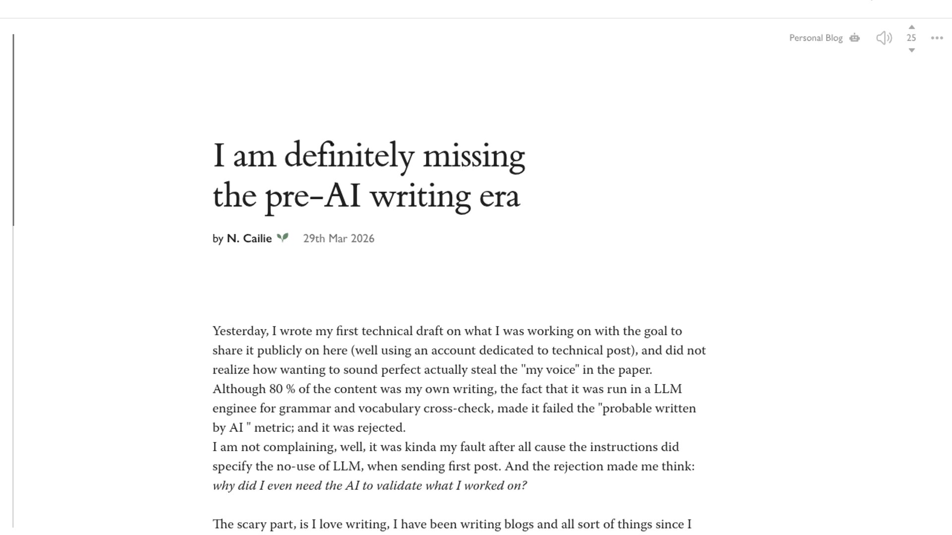 A LessWrong essay recounts a first technical draft that tripped a “probably written by AI” check after the author ran it through an LLM for grammar and vocabulary. The piece argues that the bigger cost of AI writing help is losing confidence in first drafts and in your own voice.
