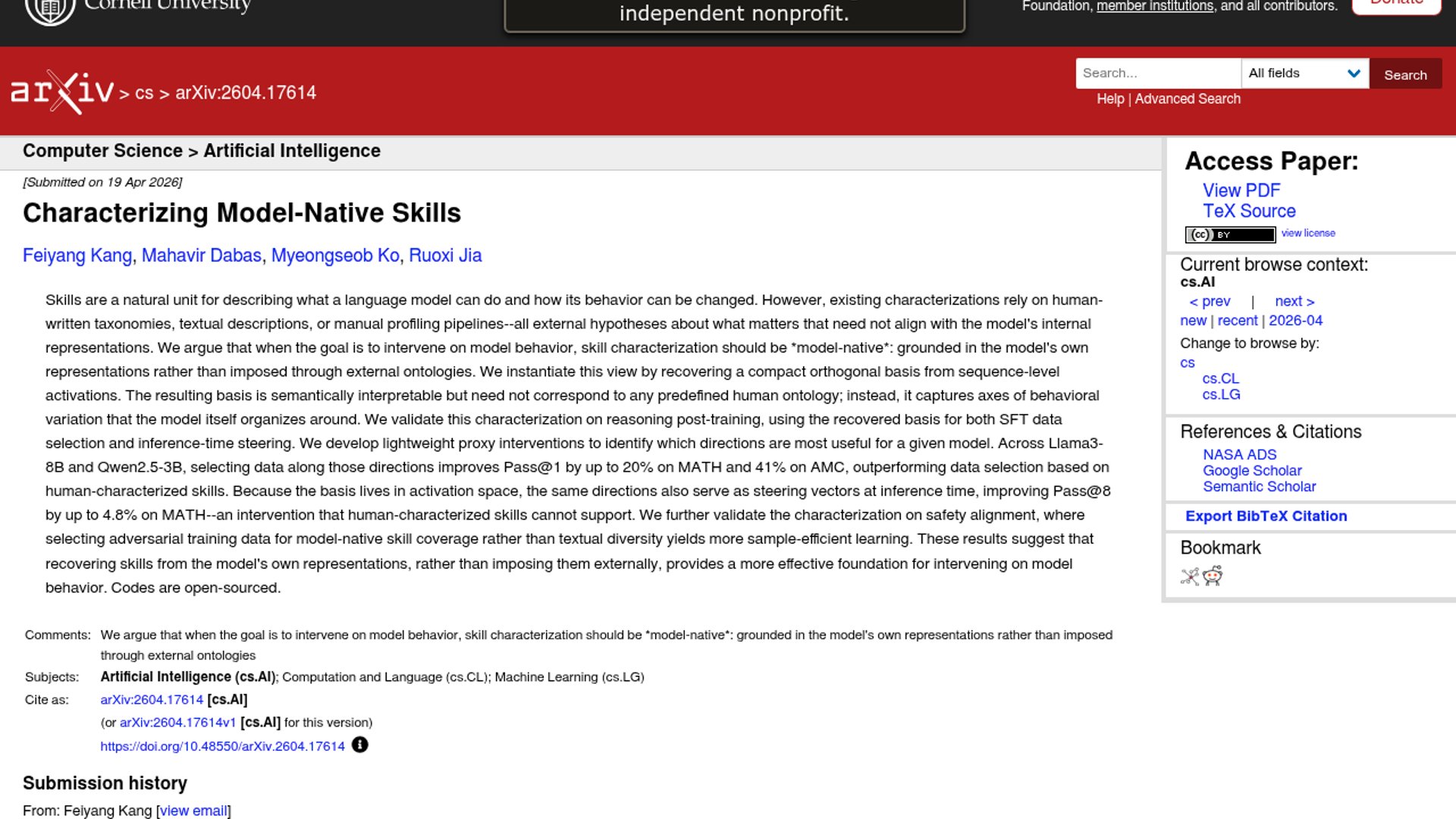 "A Virginia Tech research paper proposes \"Model-Native Skills\" derived directly from internal activation spaces rather than human-written taxonomies. By recovering a compact orthogonal basis of behavioral variation, the researchers demonstrate up to a 41% performance boost in mathematical reasoning and enable direct, training-free steering of model behavior during inference." This is 2 sentences. I should remove the markdown escapes in the summary (the `\"`). Wait, the summary says "proposes \"Model-Native Skills\"". I'll clean that up.
