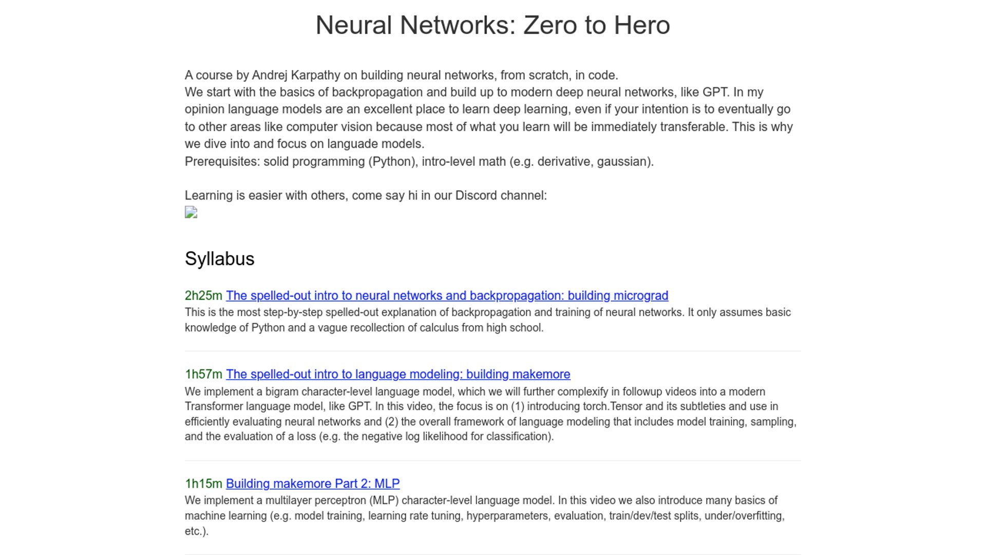 - –Karpathy's curriculum is sequenced from micrograd to GPT/tokenizer and is roughly 13.5 hours total, which makes it the closest thing to a single-track crash course that still reaches modern LLM plumbing: https://karpathy.ai/zero-to-hero.html