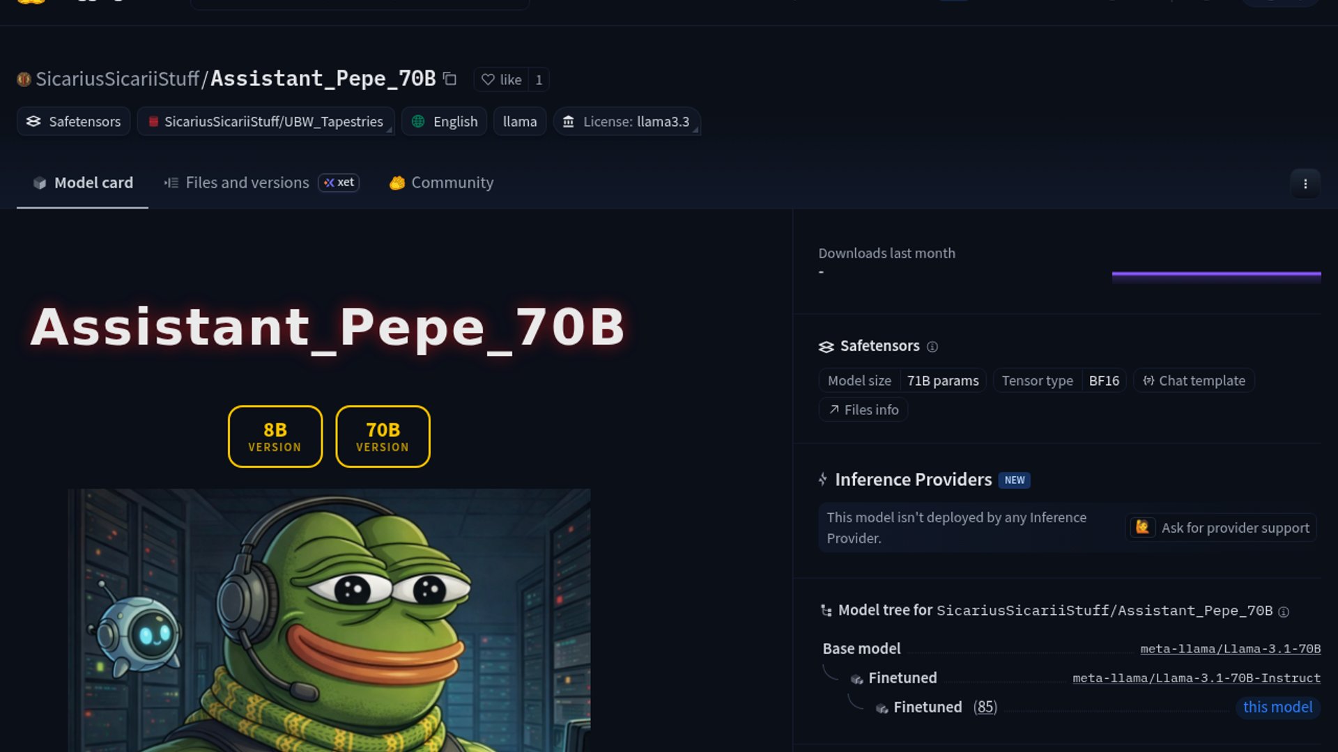 Assistant Pepe 70B is a Llama-3.1-based model fine-tuned on unconventional data to overcome "Assistant brain" and excel at creative reasoning. The model demonstrates a unique ability to solve trick questions that frequently stump frontier LLMs like Claude Sonnet 4.6.