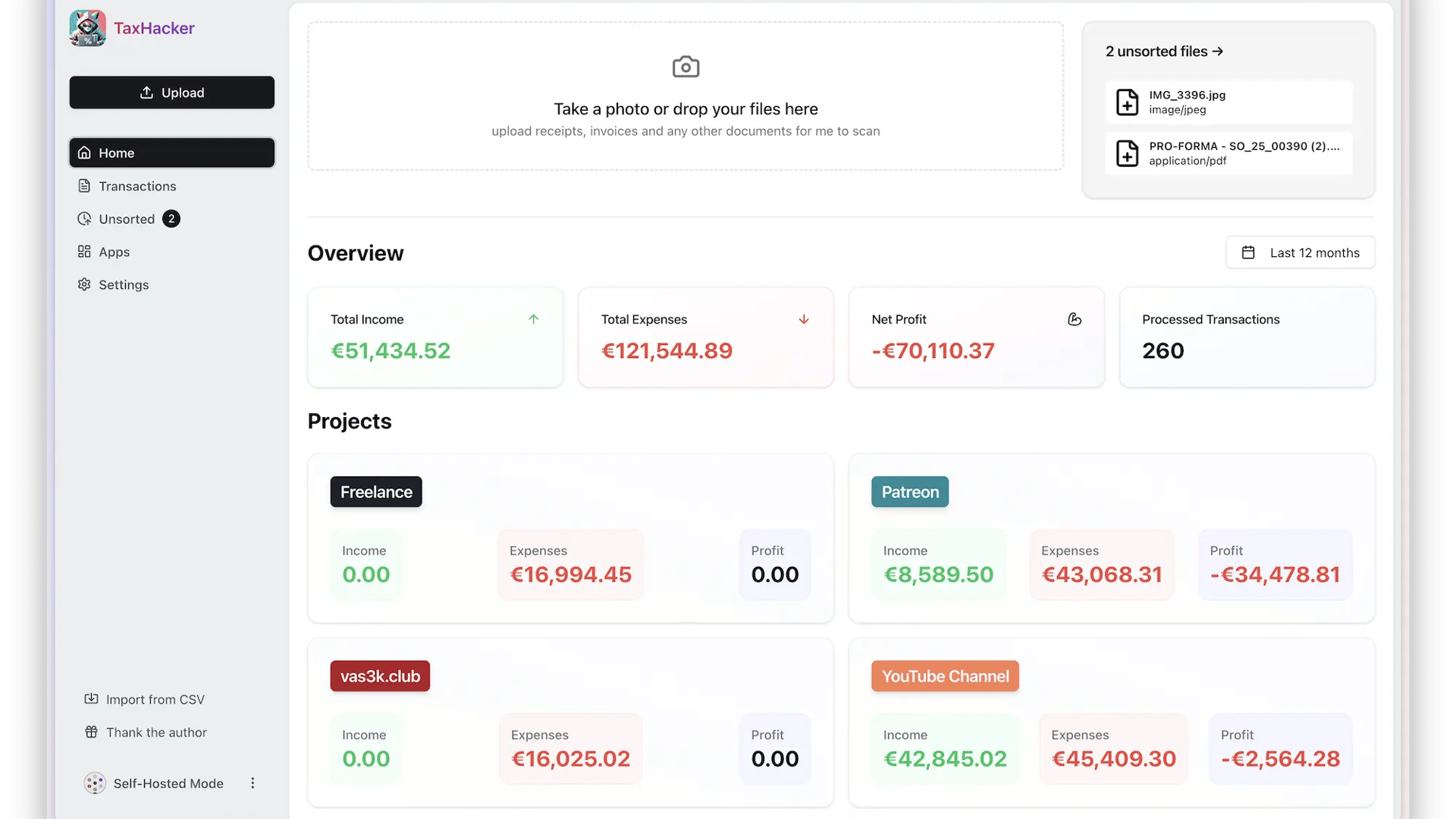 TaxHacker is a self-hosted accounting app that uses LLMs to extract data from receipts, invoices, bank statements, and transactions. It’s built for freelancers and small businesses that want custom prompts, categories, and multi-currency handling without handing financial docs to a SaaS.