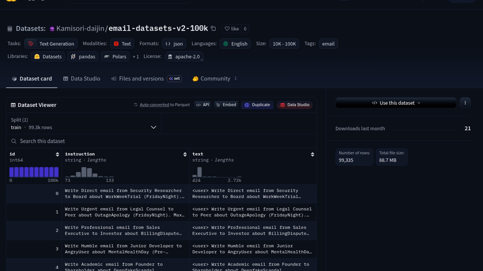 - –The Hugging Face card shows `99.3k` rows, so the “100k” label is approximate rather than exact.