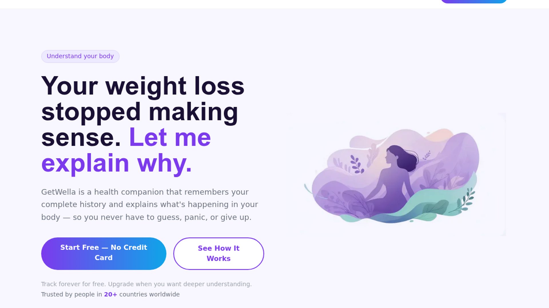GetWella is a women’s health app aimed at users 40 and older who want more than calorie counting and streaks. It tracks daily signals like sleep, stress, energy, and weight, then uses AI to explain why a plateau, crash, or recovery pattern may be happening. The positioning is intentionally supportive rather than prescriptive: no judgment, no calorie logging, and a free 14-day trial with no credit card required.