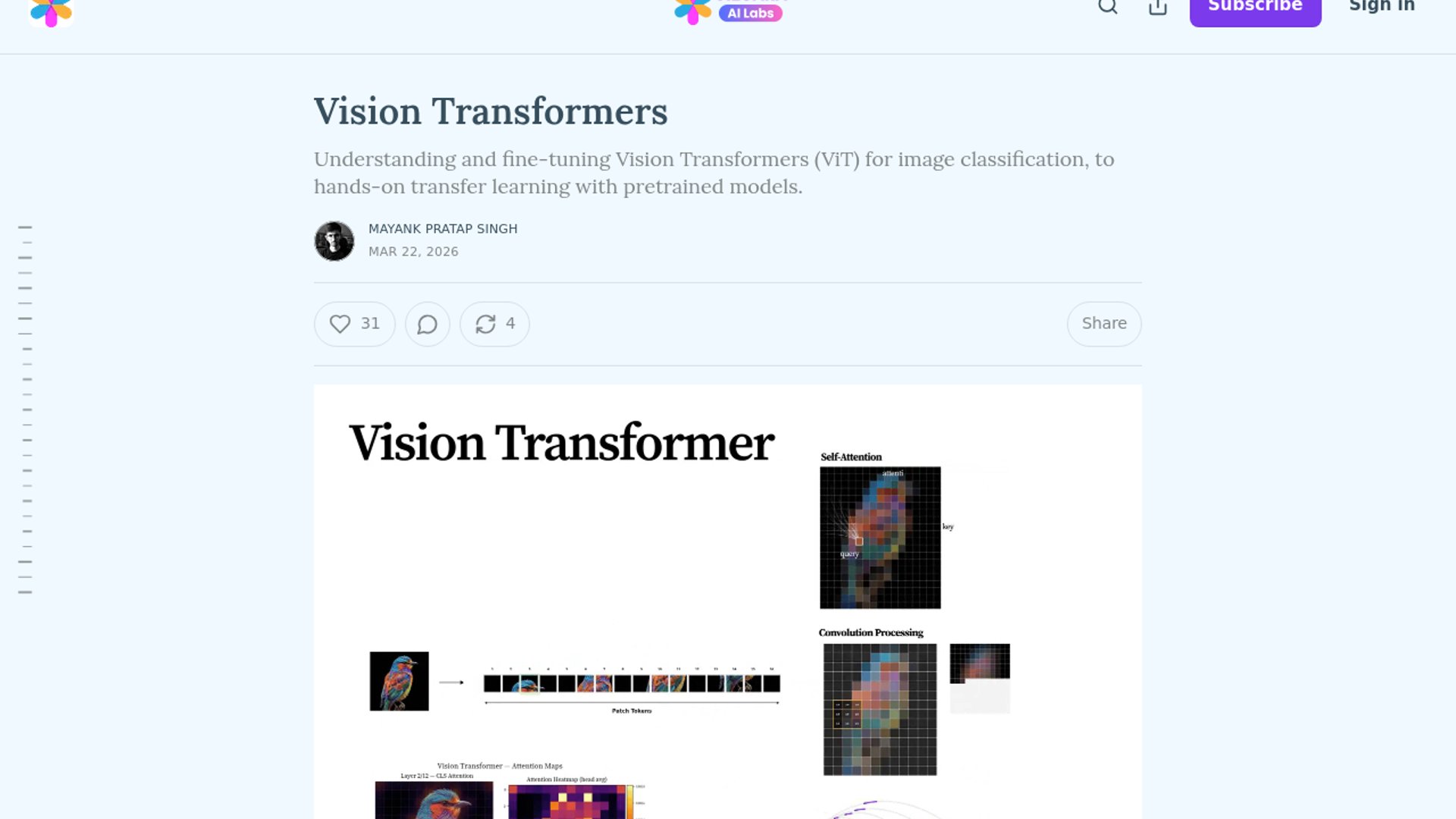 Mayank Pratap Singh's visuals-first Vizuara post builds ViTs from patch embeddings and positional encodings all the way to a hands-on fine-tune on Oxford-IIIT Pet. It's a practical bridge between the original paper and a runnable image-classification workflow.