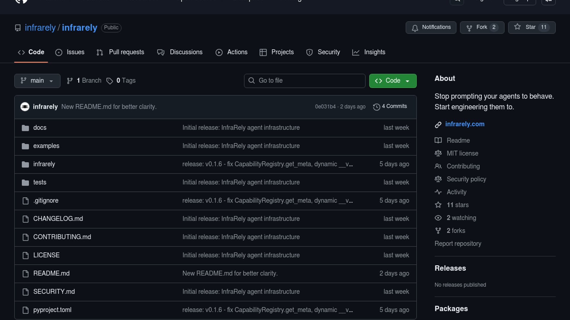 InfraRely is an open-source control layer for AI agents that moves routing, validation, verification, and tracing out of the prompt and into code. The pitch is that the LLM should reason, but it should not own execution flow in production.