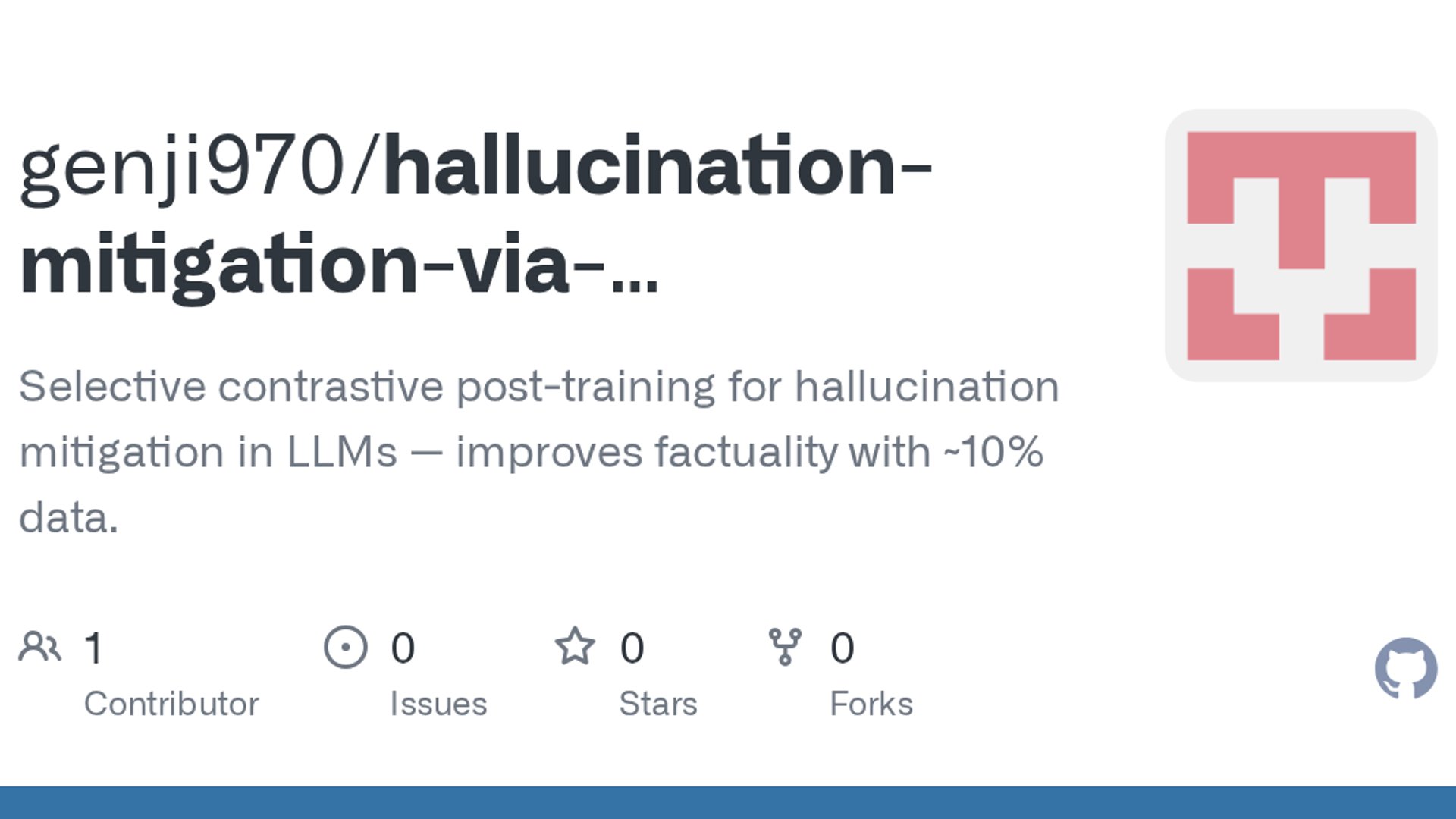 This side project releases code for a selective contrastive post-training method that frames hallucination as a preference problem: a frozen base model generates a bad continuation, the training model compares it against the gold answer, and learning only happens when the preference margin is weak. The repo describes first-divergence loss masking, a gated objective, and benchmark gains that are presented as improved factuality with roughly 10% of the data.