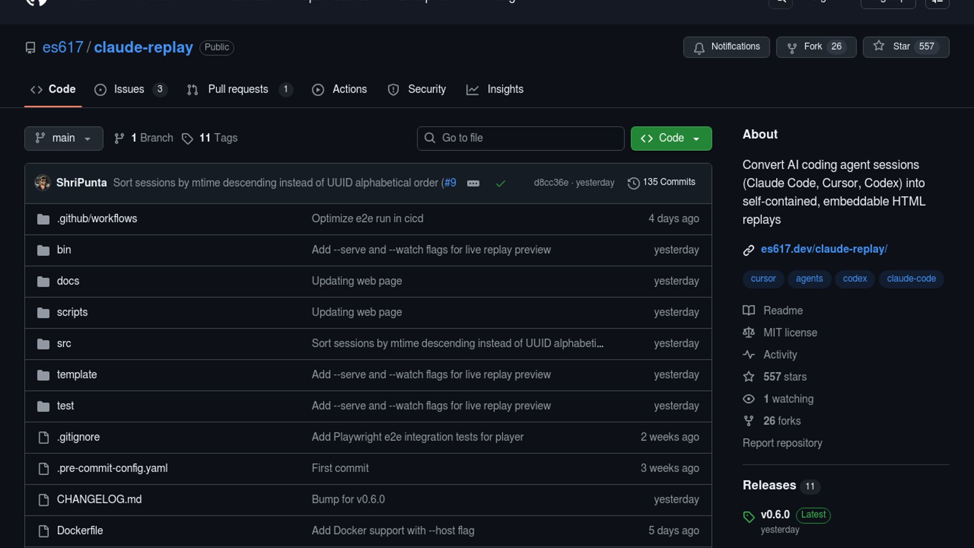 claude-replay converts Claude Code, Cursor, and Codex CLI session logs into a single self-contained HTML replay. It’s built for sharing, reviewing, embedding, and archiving agent work without relying on video or noisy raw transcripts.
