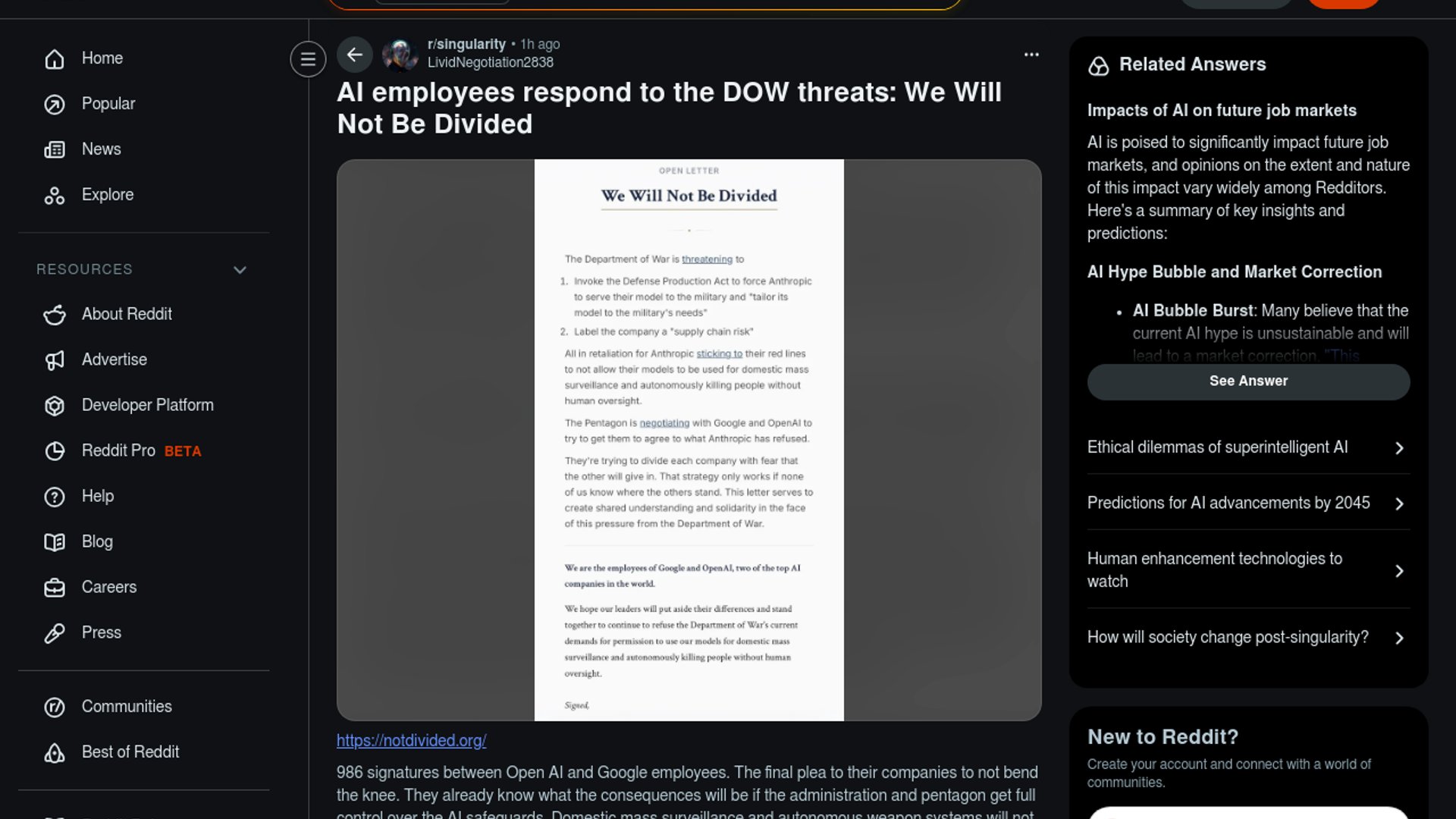 We Will Not Be Divided is an open letter and signature campaign for current and former Google and OpenAI employees urging their companies to reject Pentagon pressure to permit domestic mass surveillance and autonomous killing without human oversight. The project positions itself as a solidarity effort backing Anthropic’s refusal to cross those AI red lines.