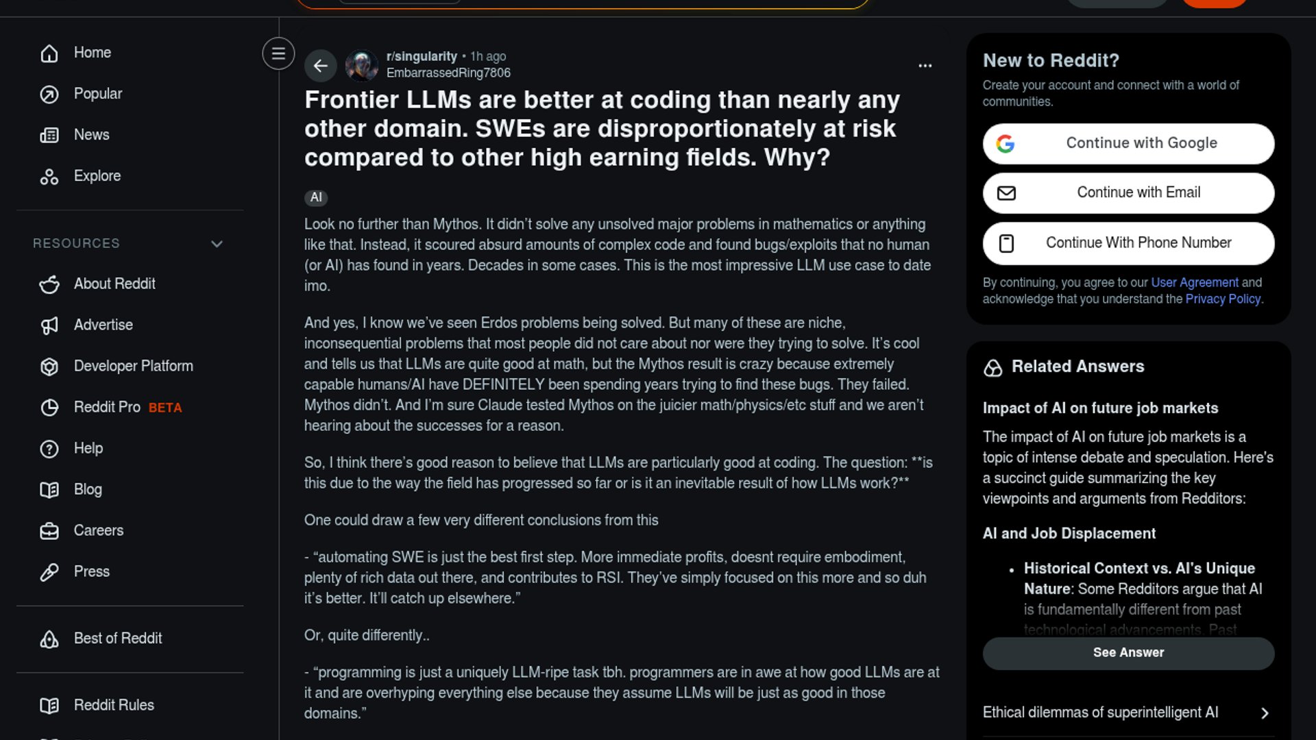 The post argues that Anthropic’s Mythos Preview is unusually strong at code-centric work, especially bug and exploit discovery, because it can scan enormous codebases and surface issues humans have missed for years. The author uses that example to ask whether software engineering is being hit first because labs have focused model effort there, or because programming is inherently a better fit for how LLMs learn and reason.