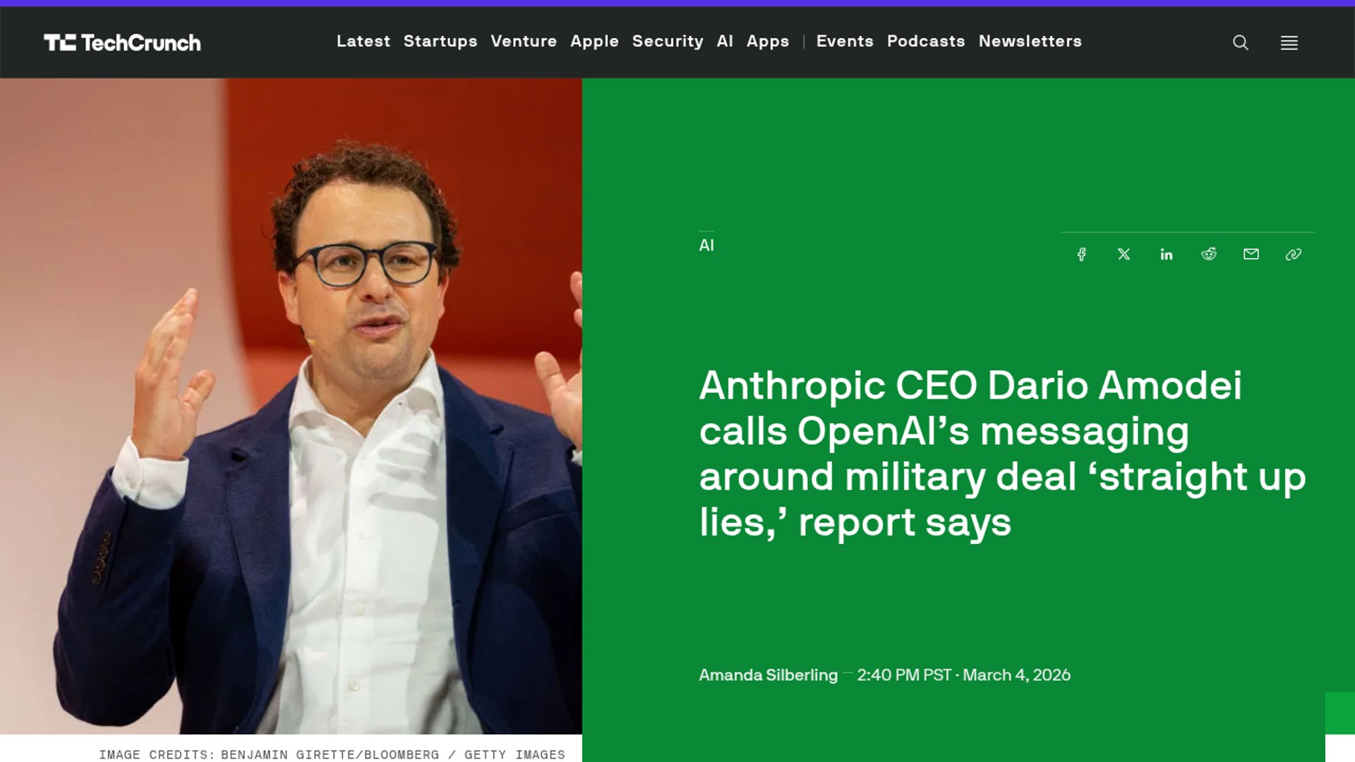 Anthropic CEO Dario Amodei said OpenAI’s public framing of its new U.S. defense deal was “straight up lies,” according to a March 4, 2026 TechCrunch report citing an internal memo. The dispute follows Anthropic’s February 26 statement that it supports defense use of AI but refuses contract terms that could enable mass domestic surveillance or fully autonomous weapons.
