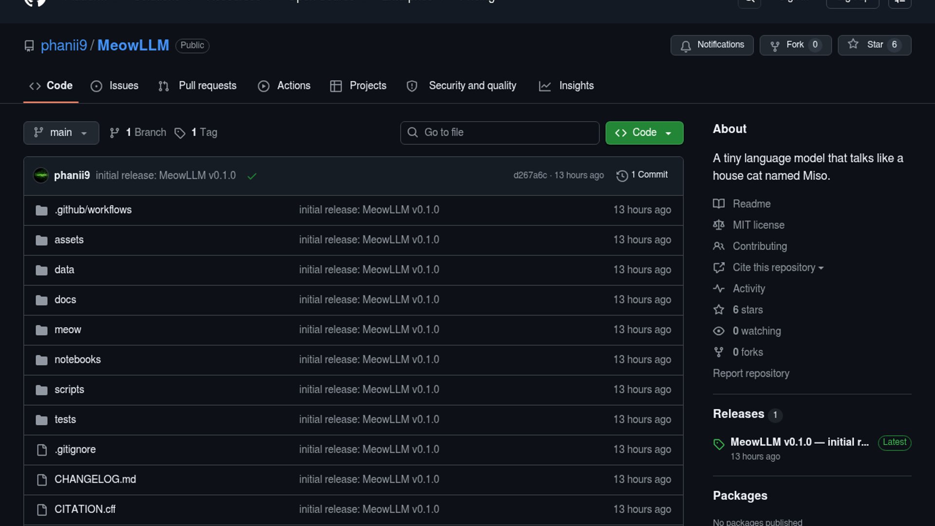 MeowLLM is a ~3.5M-parameter language model trained from scratch to speak as Miso, a house cat, with the personality encoded in the weights rather than via prompting or fine-tuning. The repo includes the full pipeline: data generation, tokenizer training, masking, evaluation, inference, documentation, and tests, plus a Colab path to chat with the pretrained checkpoint or train your own. It is positioned as a compact, educational end-to-end example of building a character model rather than a practical general-purpose LLM.