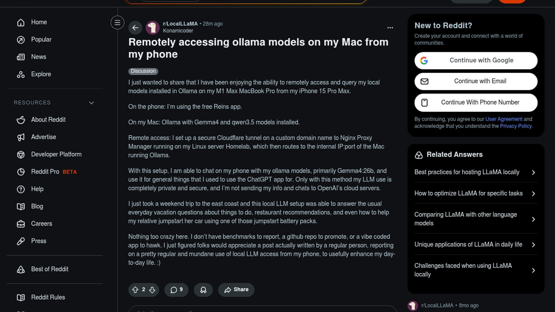 This Reddit post is a practical walkthrough of using Ollama models on a Mac as a private, remote assistant from an iPhone. The setup combines Reins, a Cloudflare Tunnel, and Nginx Proxy Manager to expose local models like Gemma and Qwen over a secure endpoint.