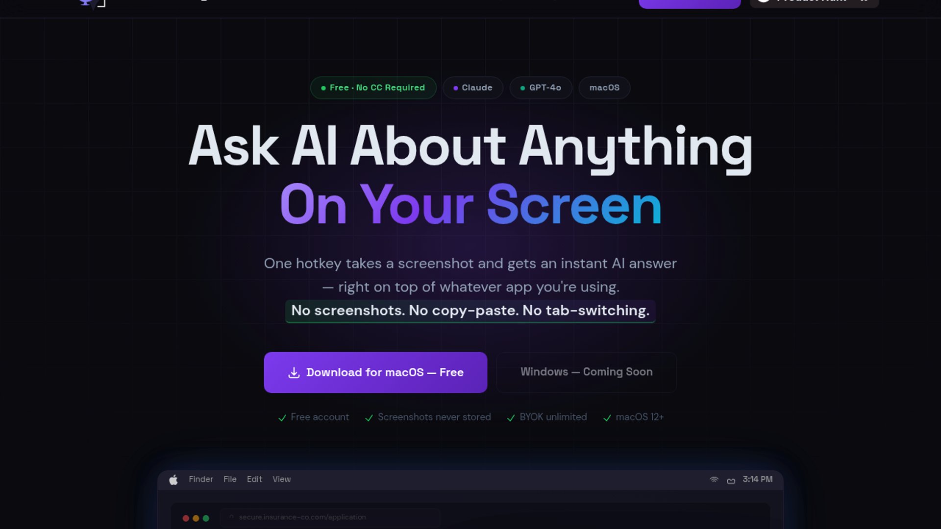 ScreenGeany AI is a new macOS utility that lets users hit a global hotkey, capture whatever is on screen, and ask Claude or GPT-4o questions without tab switching or manual copy-paste. The pitch is fast ambient AI assistance with a privacy-first angle: screenshots stay in RAM, the app supports BYOK, and the initial launch offers a free tier plus a $11.99/month Pro plan.