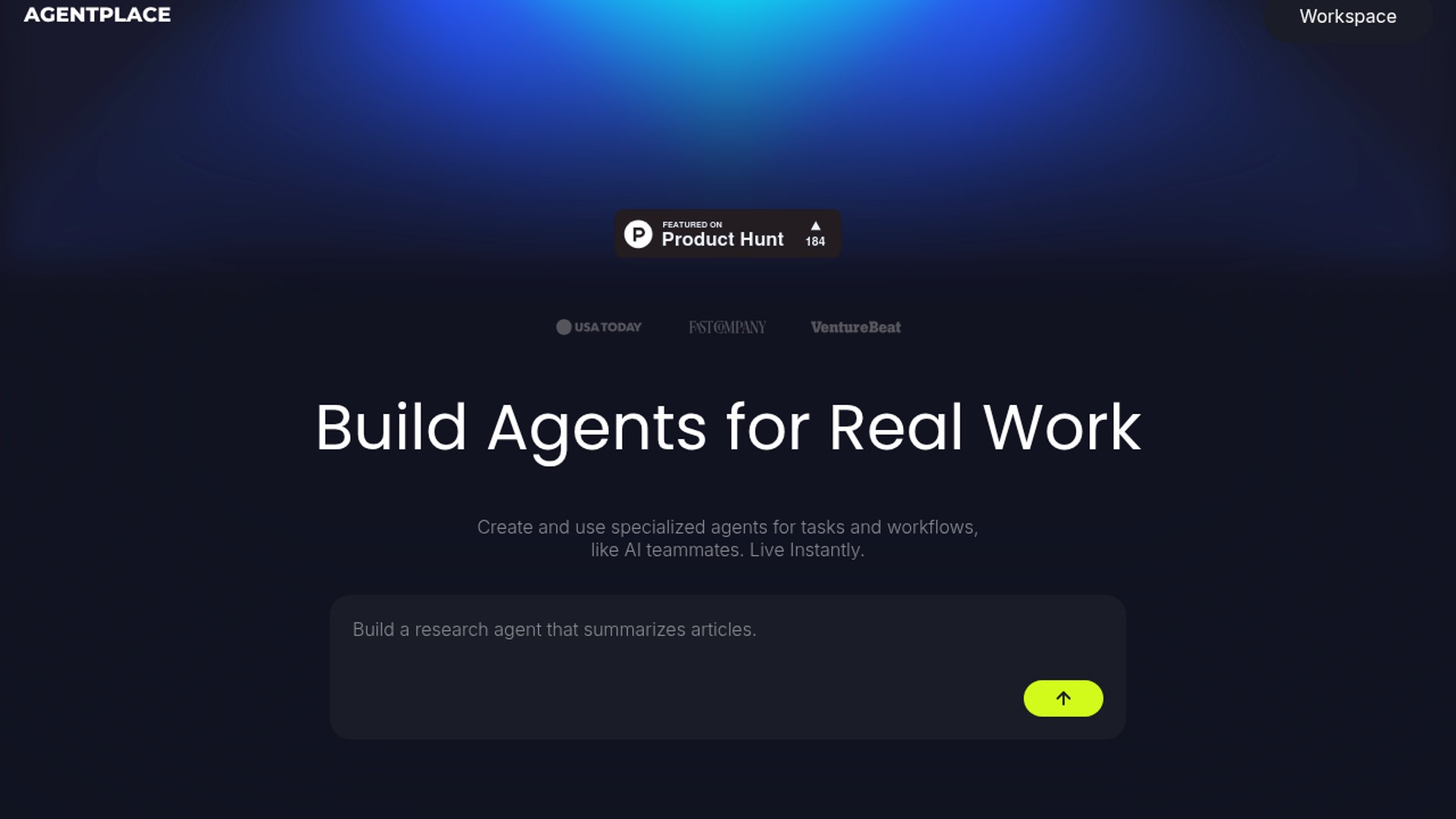 Agentplace is a no-code workspace that allows teams to create, deploy, and manage specialized AI agents via "vibe coding" and instant cloud deployment. It leverages the Model Context Protocol (MCP) to connect agents with standard business tools and features a Human-in-the-Loop interface for tasks requiring human review.