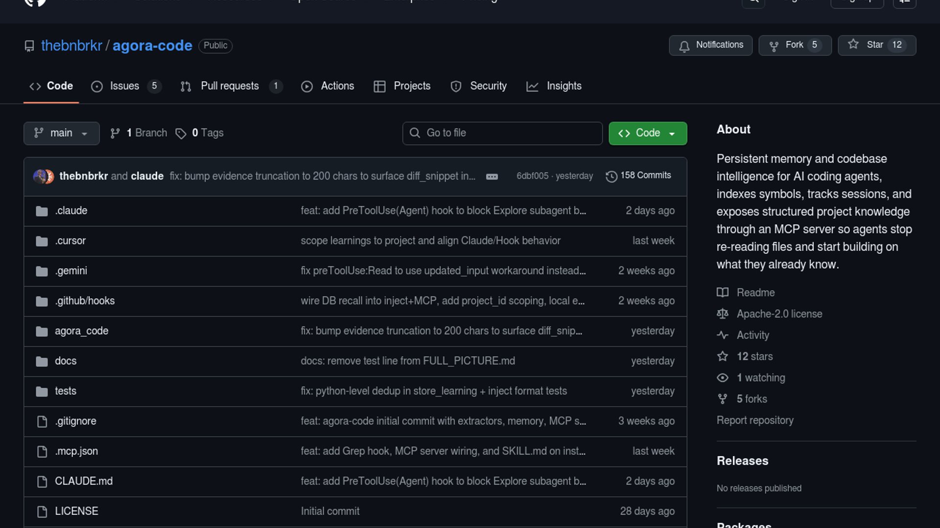 agora-code is the "long-term memory" upgrade AI coding agents need for professional-scale projects. It uses AST-based context optimization to cut token usage by 95%, while persistent SQLite-backed memory and multi-agent hooks for Claude Code and Cursor ensure codebase intelligence survives session restarts across 160+ supported languages.