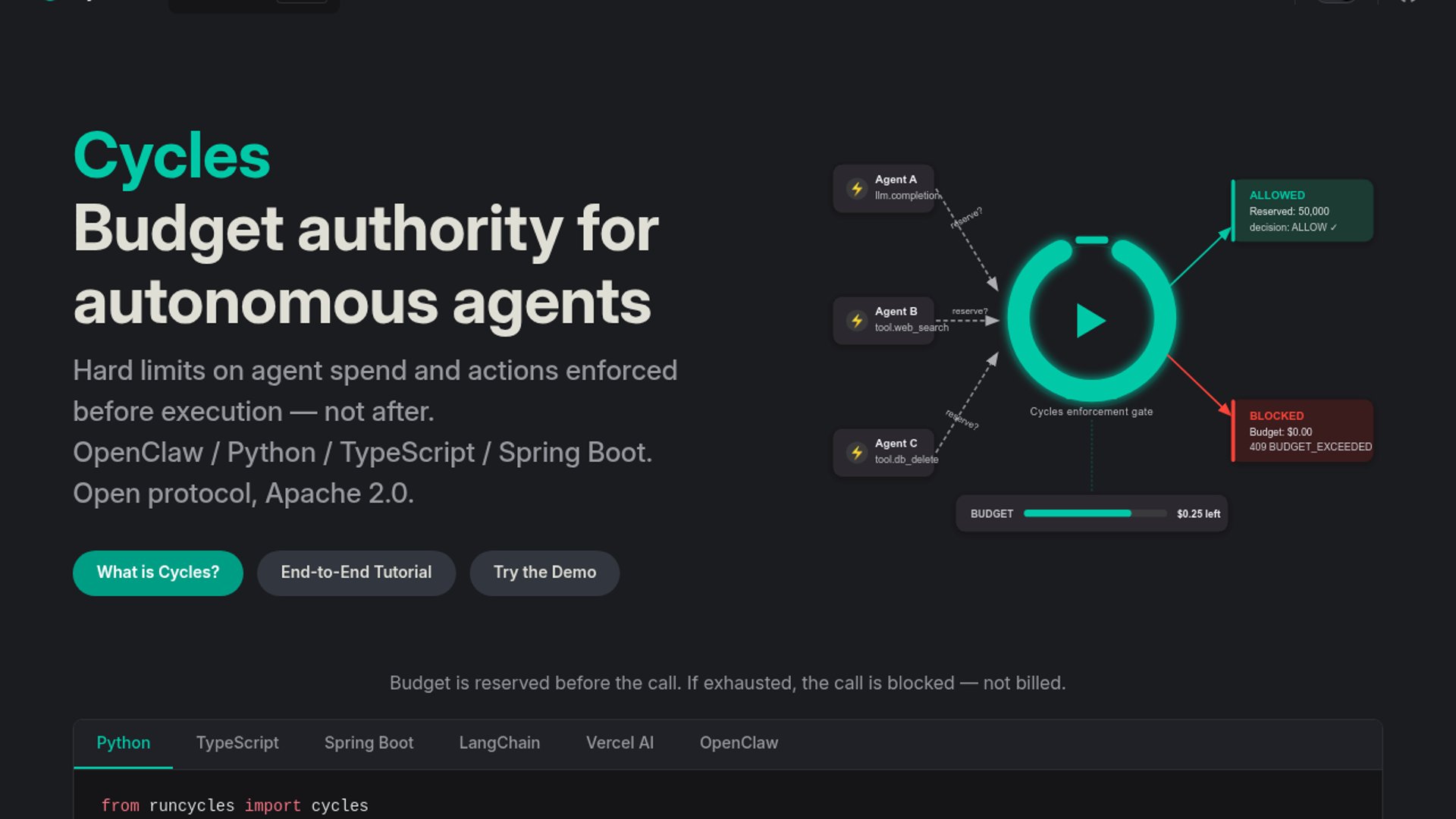 Cycles is an open protocol for pre-execution budget enforcement on autonomous agents. It reserves estimated cost before each LLM call, commits actual usage after, and releases any remainder on failure.