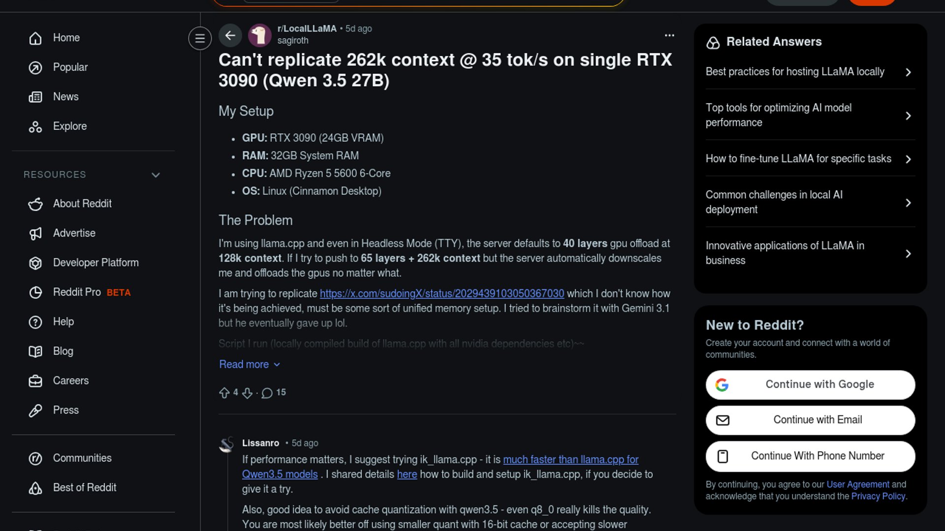 A LocalLLaMA user says they cannot reproduce a viral claim that Qwen3.5-27B can sustain 35 tok/s at 262K context on a single RTX 3090 using llama.cpp. The thread is a useful reality check on how quickly local LLM benchmark claims can fall apart once VRAM limits, KV-cache settings, and GPU offload behavior enter the picture.