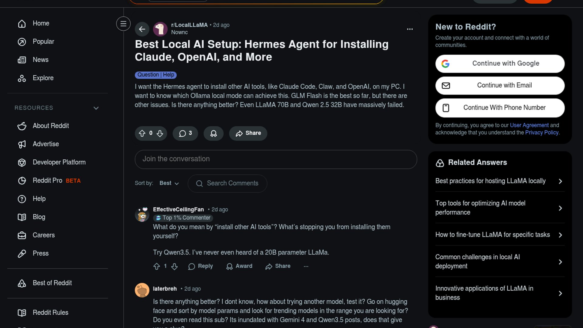 Hermes Agent is the subject of a LocalLLaMA help post about which Ollama-backed model can reliably drive installs and tool use on a PC, including setup around Claude Code and OpenAI tools. The poster says GLM Flash has been the least bad option so far, while LLaMA 20B and Qwen 2.5 32B both failed their setup.