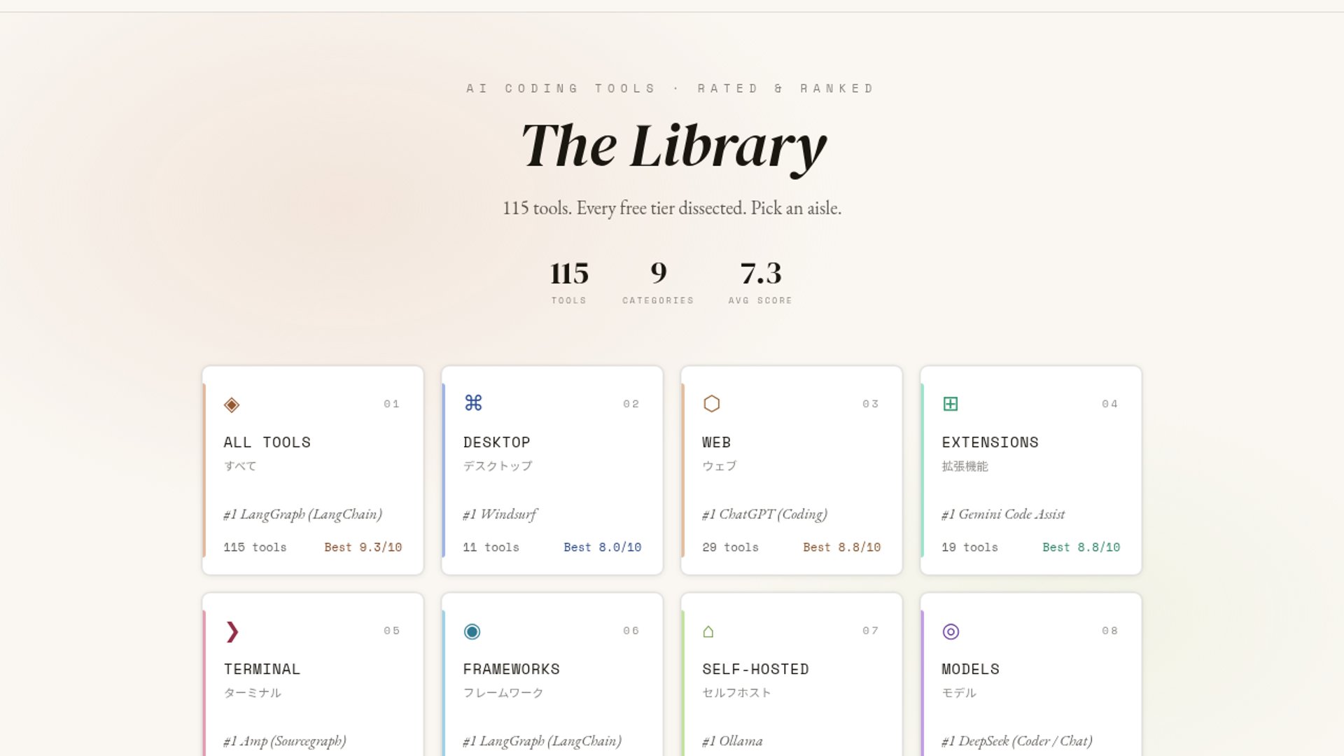 Tolop is a free directory for comparing AI coding tools, from code editors to terminal agents, with an emphasis on structure, scoring, and a distinctive bookshelf-style UI. The creator says it already tracks 115 tools across 9 categories and was built with Next.js and Tailwind.