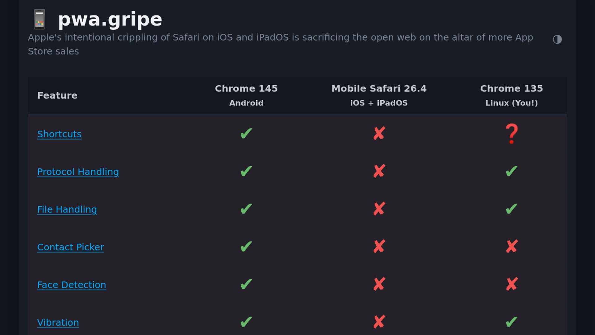 pwa.gripe is a technical comparison dashboard that exposes the massive functional disparity between Progressive Web Apps (PWAs) on Android versus iOS. The site argues that Apple’s refusal to support modern web APIs is a strategic business decision designed to force developers into the native App Store ecosystem, effectively keeping the open web a second-class citizen on mobile.